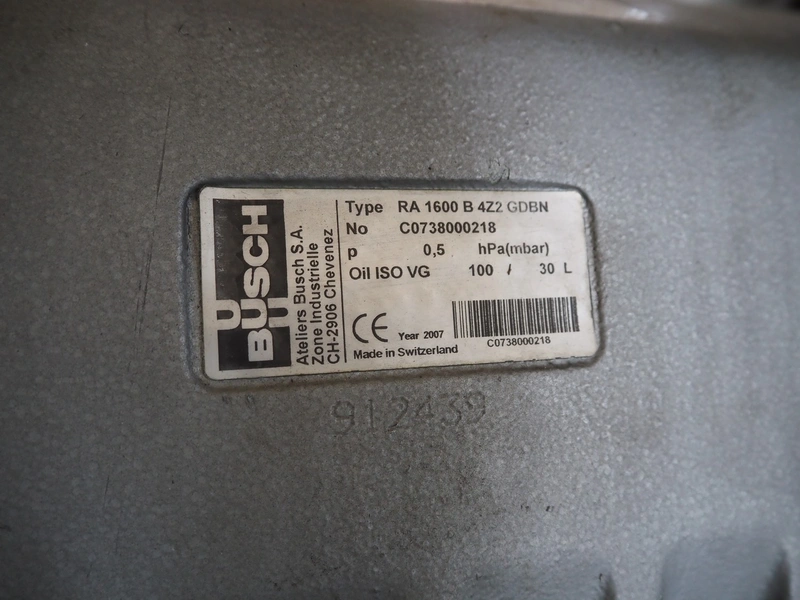 Busch vacuum pump, type: RA 1600 B 4Z2 GDBN, number: C0738000218, year of construction: 2007, capacity: 1600 m³ per hour, dimensions: 2300 mm x 1200 mm x 1500 mm. Lot located in Pojana Maggiore (IT), viewing and pick up in consultation with Industrial Auctions B.V.