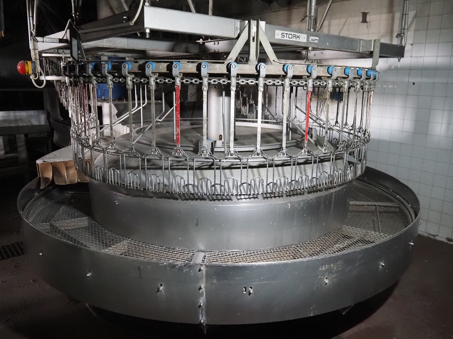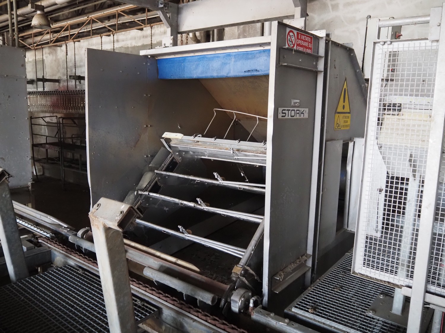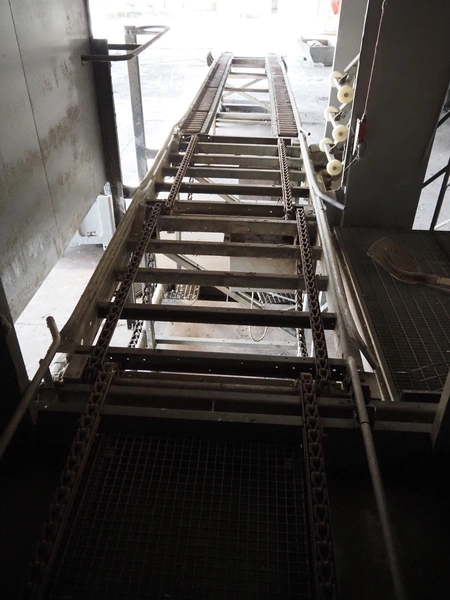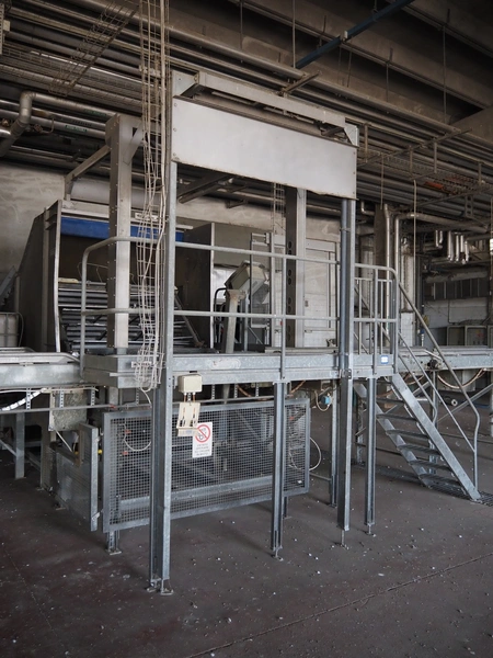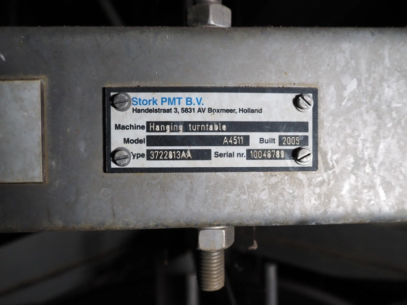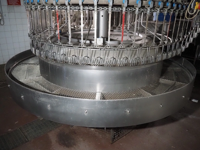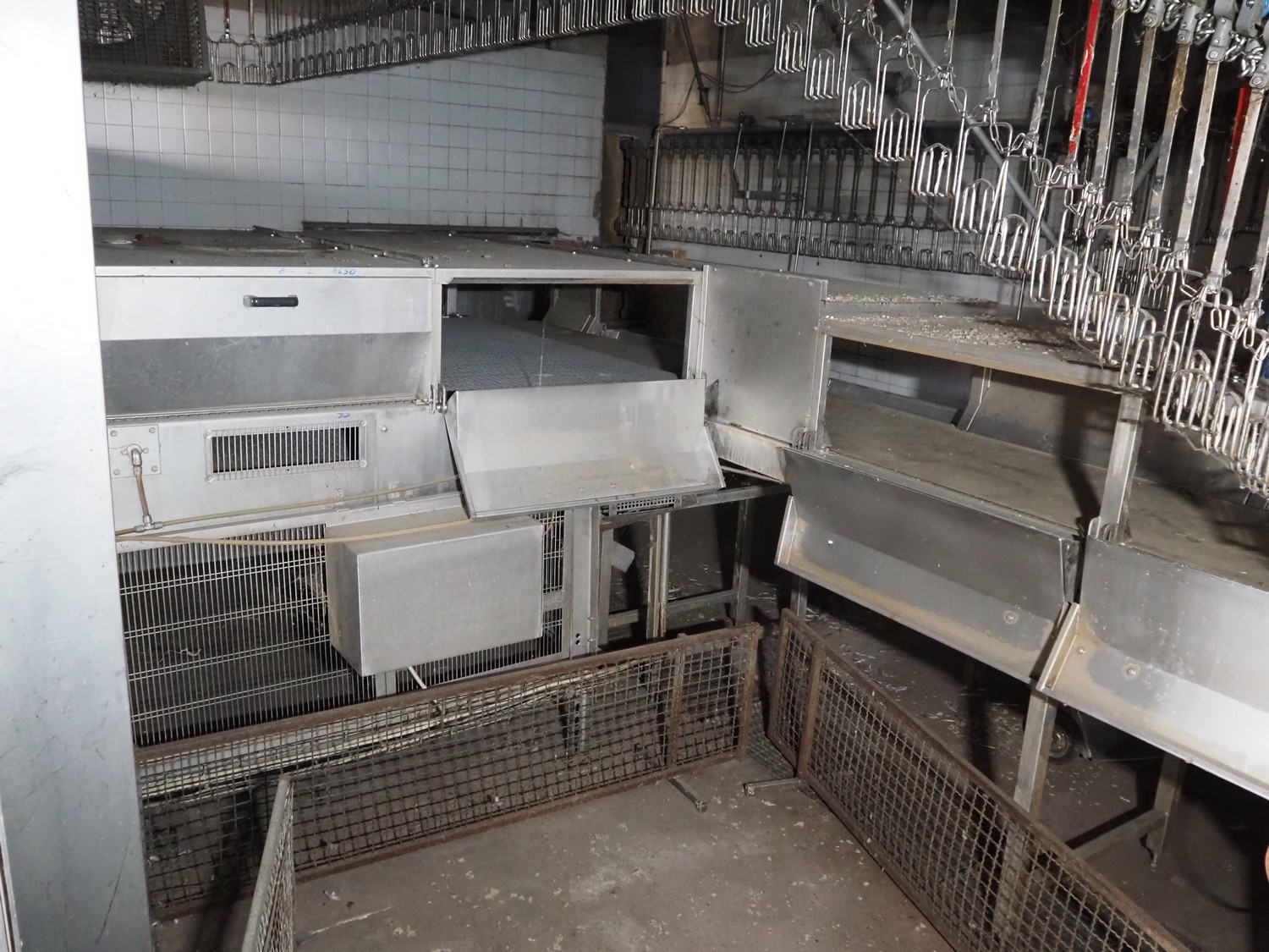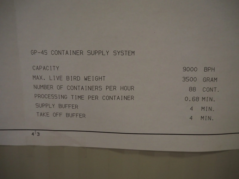 Stork PMT B.V. container supply system with container washer, type: G.P. System, model: 4S, type: 3722814, serial number: 10048897, year of construction: 2005, capacity: 9.000 broilers per hour, maximum live bird weight: 3500 gram, number of containers per hour: 88 pieces, distance between chains: 920 mm, diameter carrousel: 3400 mm, clearance washer: 1240 mm x 1540 mm, dimensions washer: 13200 mm x 2600 mm x 3600 mm, total length: 37570 mm, dimensions switch cabinet: 2400 mm x 600 mm x 2400 mm.