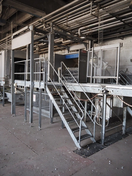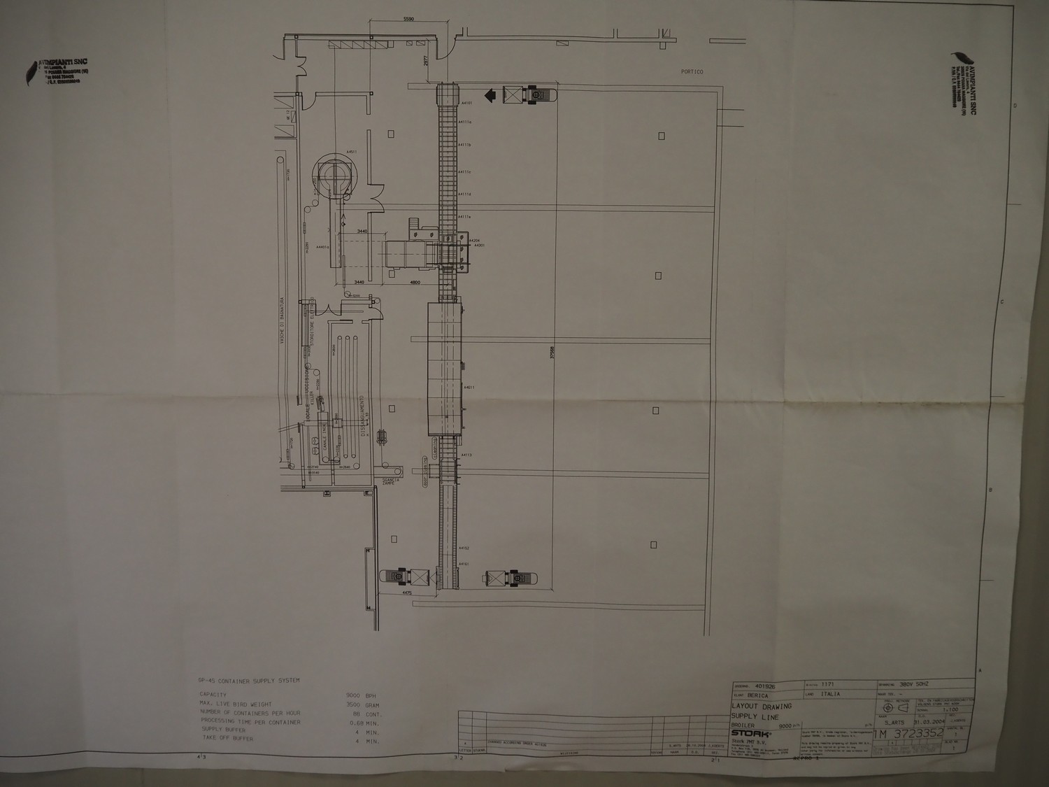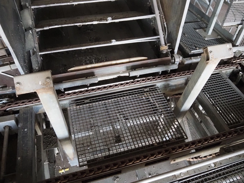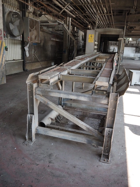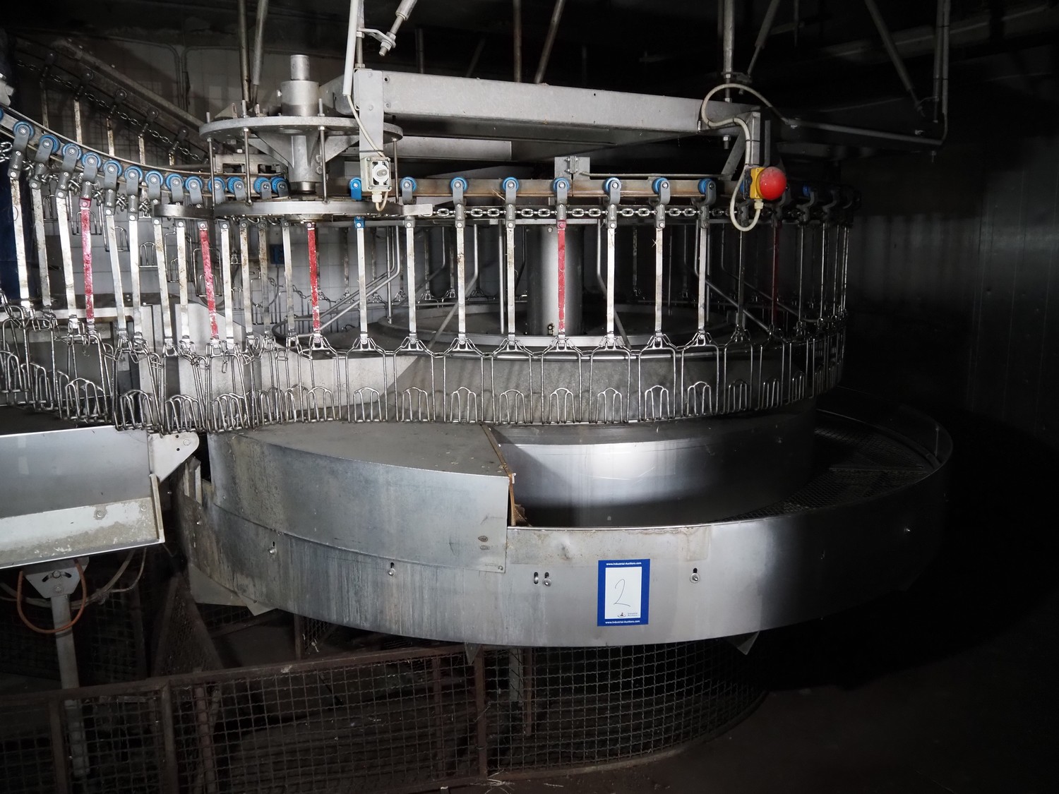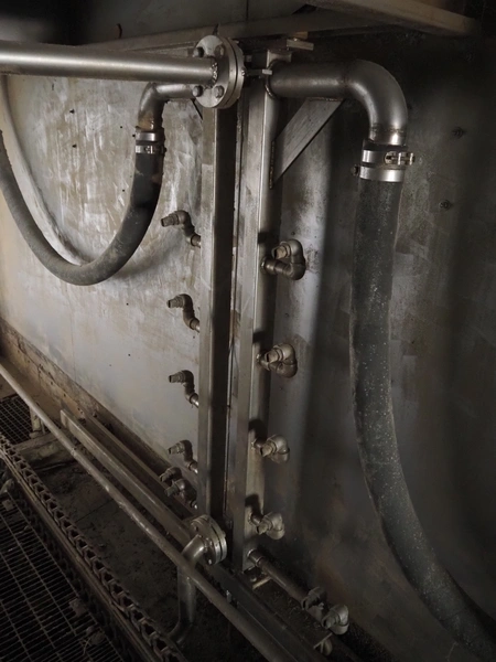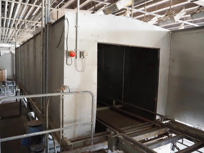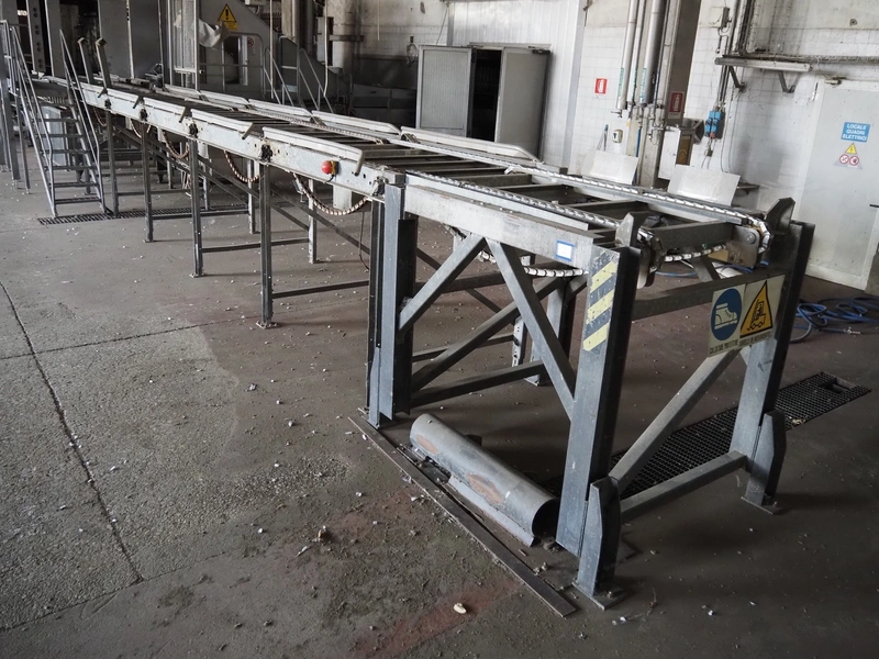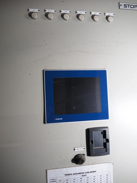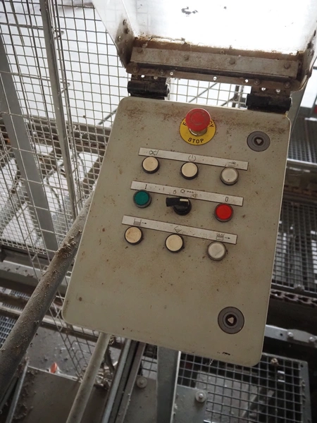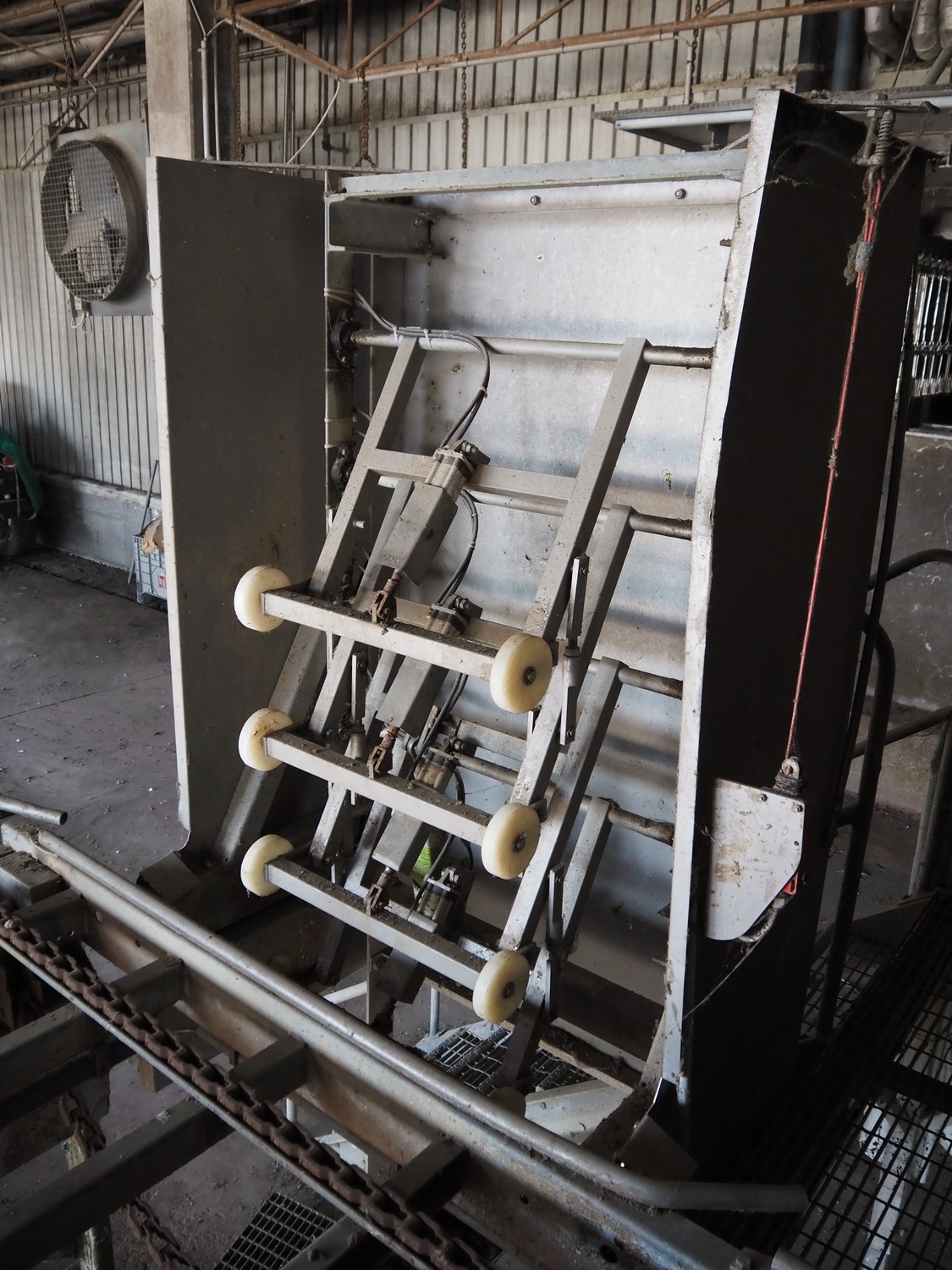 Stork PMT B.V. container supply system with container washer, type: G.P. System, model: 4S, type: 3722814, serial number: 10048897, year of construction: 2005, capacity: 9.000 broilers per hour, maximum live bird weight: 3500 gram, number of containers per hour: 88 pieces, distance between chains: 920 mm, diameter carrousel: 3400 mm, clearance washer: 1240 mm x 1540 mm, dimensions washer: 13200 mm x 2600 mm x 3600 mm, total length: 37570 mm, dimensions switch cabinet: 2400 mm x 600 mm x 2400 mm.