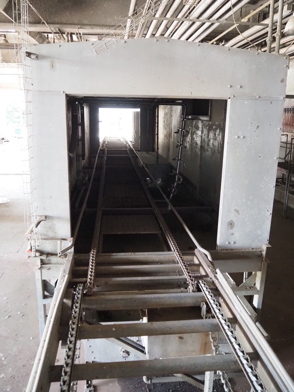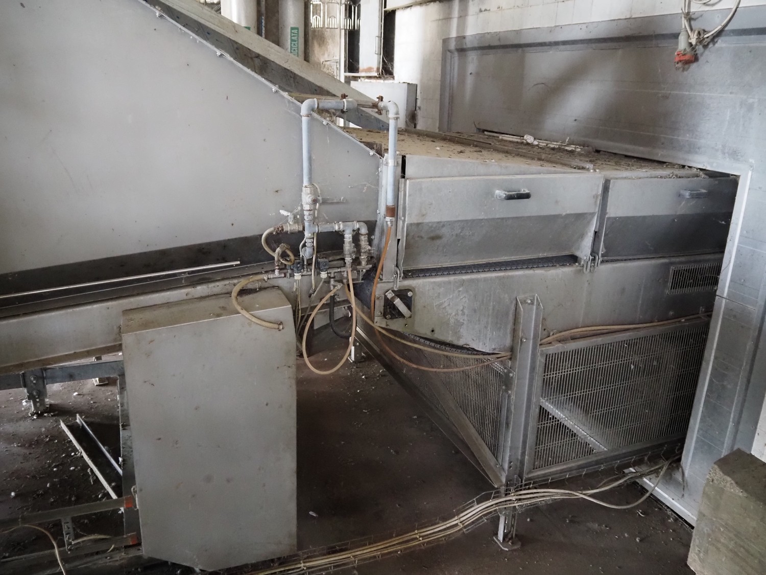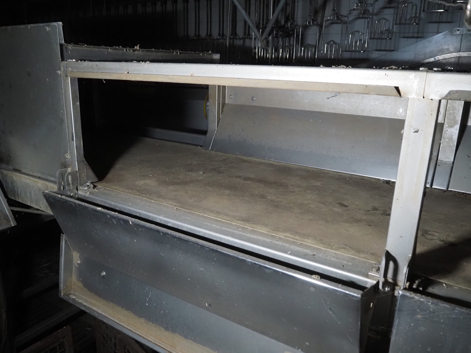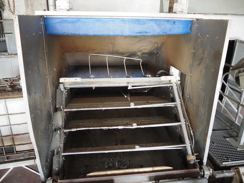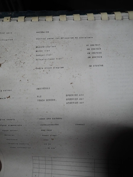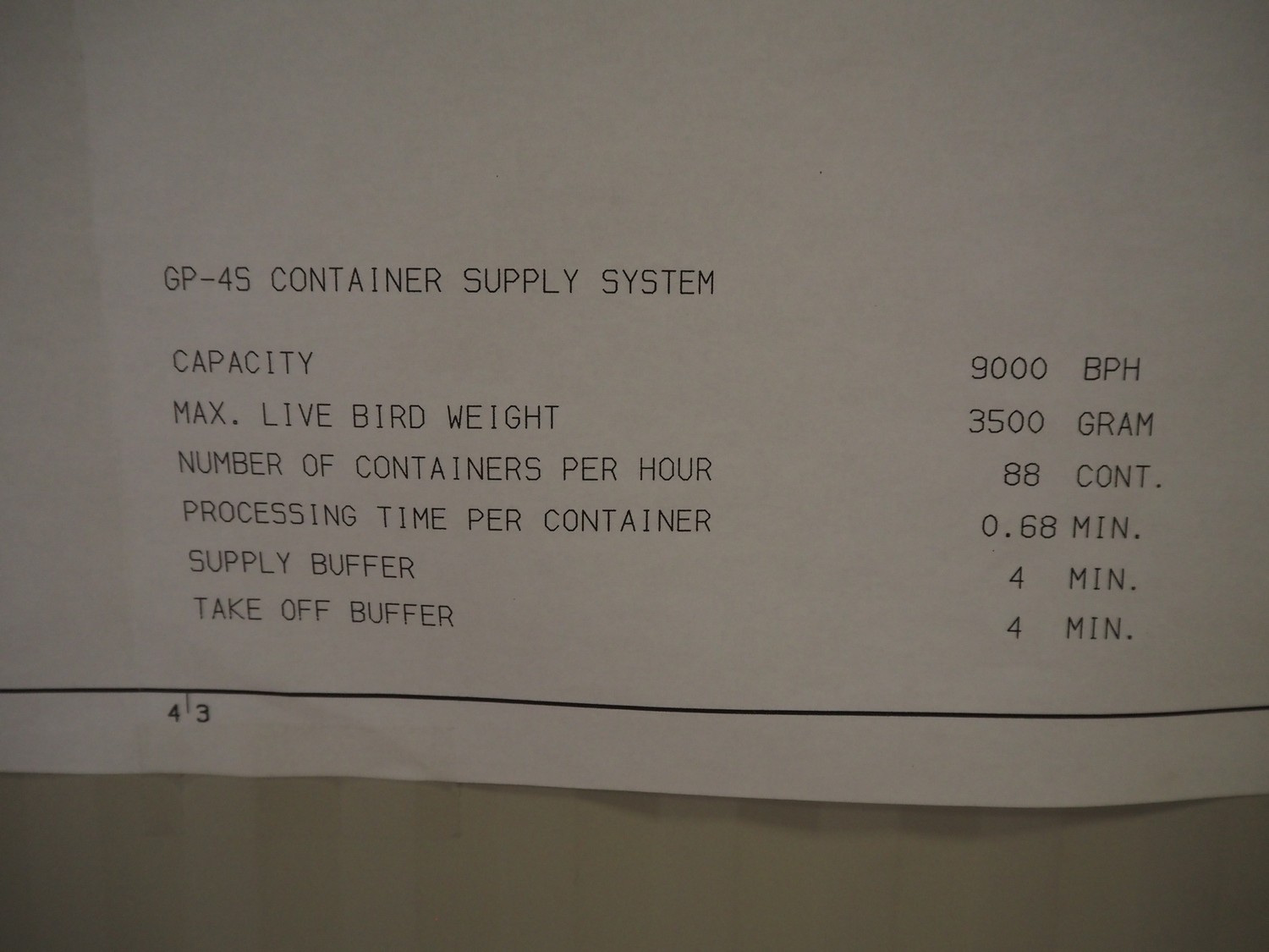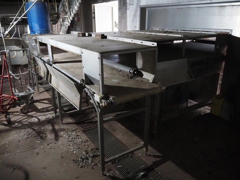 Stork PMT B.V. container supply system with container washer, type: G.P. System, model: 4S, type: 3722814, serial number: 10048897, year of construction: 2005, capacity: 9.000 broilers per hour, maximum live bird weight: 3500 gram, number of containers per hour: 88 pieces, distance between chains: 920 mm, diameter carrousel: 3400 mm, clearance washer: 1240 mm x 1540 mm, dimensions washer: 13200 mm x 2600 mm x 3600 mm, total length: 37570 mm, dimensions switch cabinet: 2400 mm x 600 mm x 2400 mm.