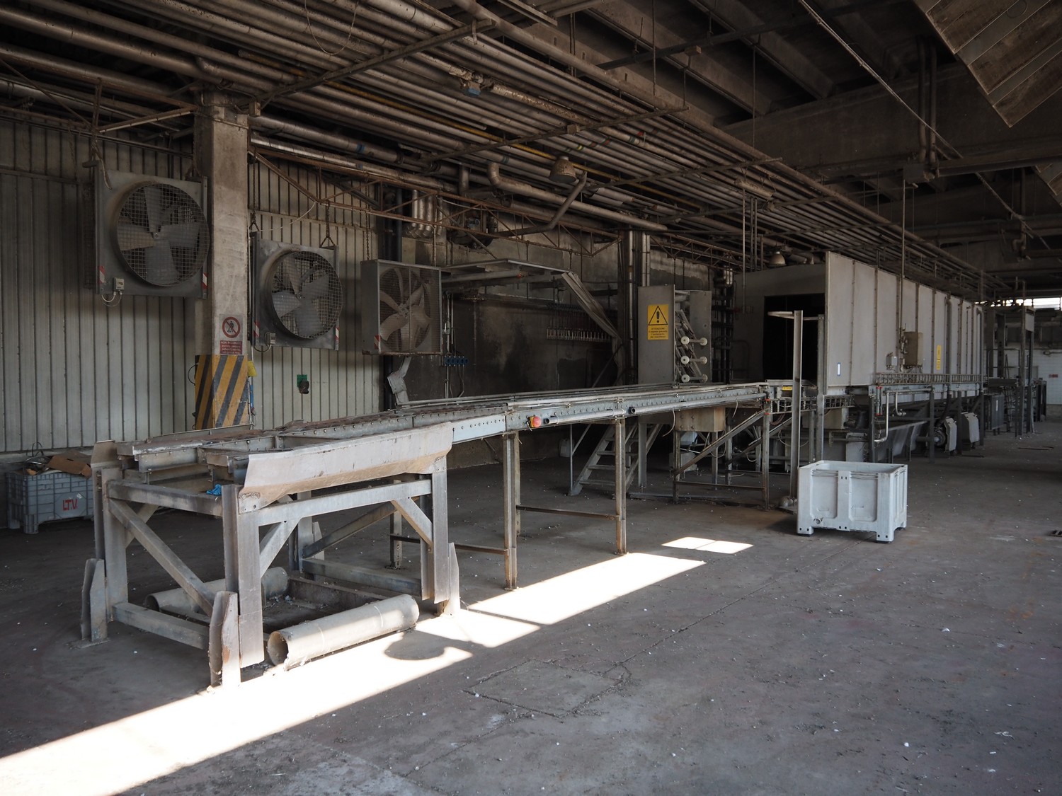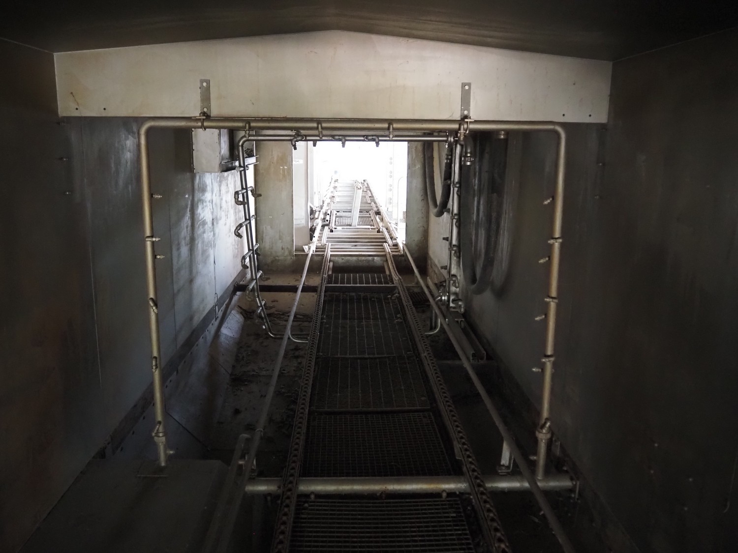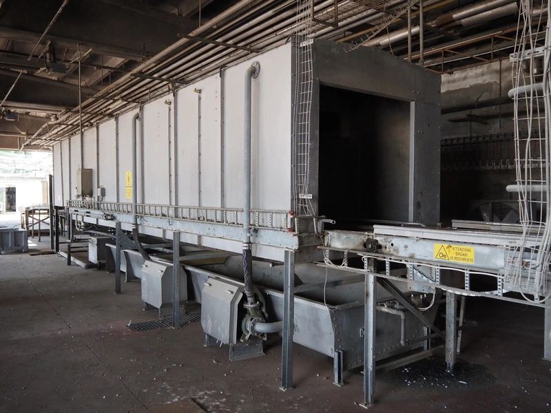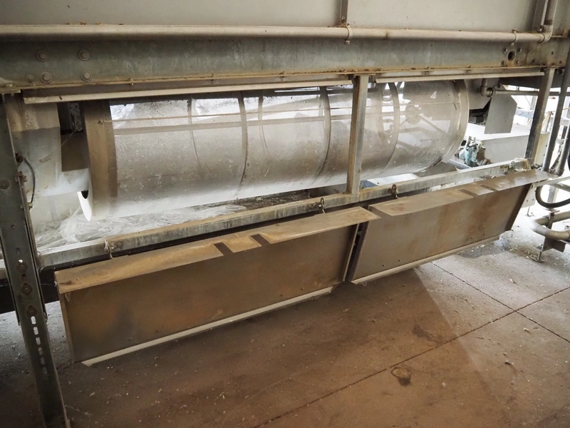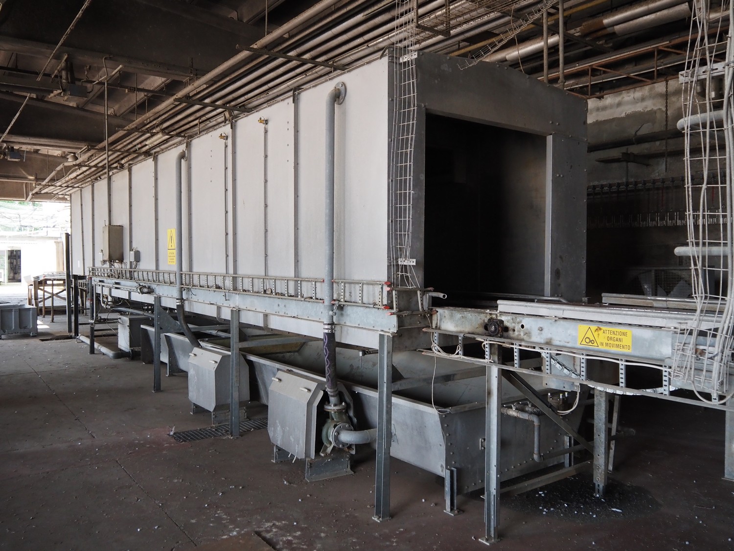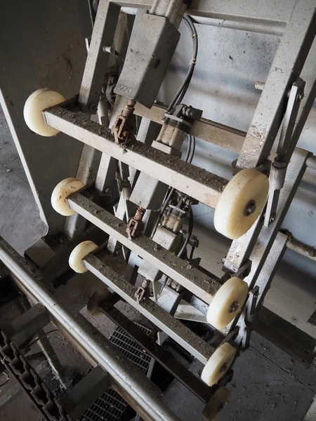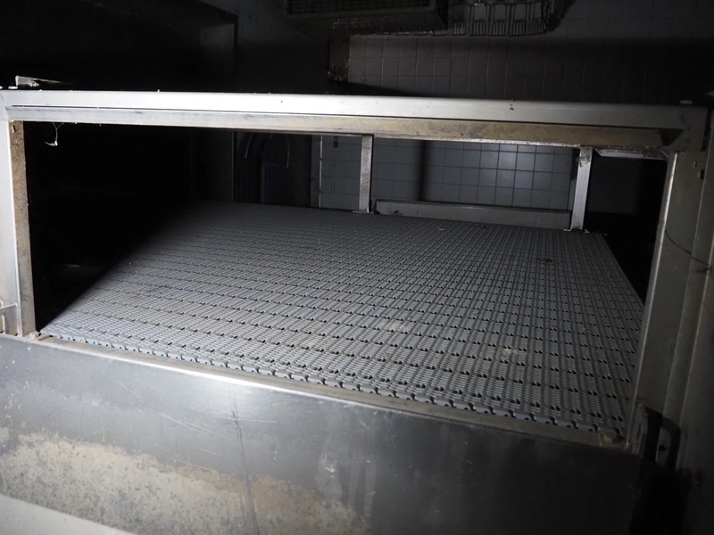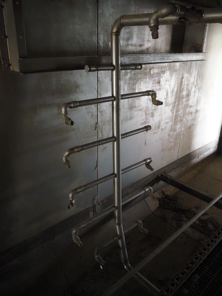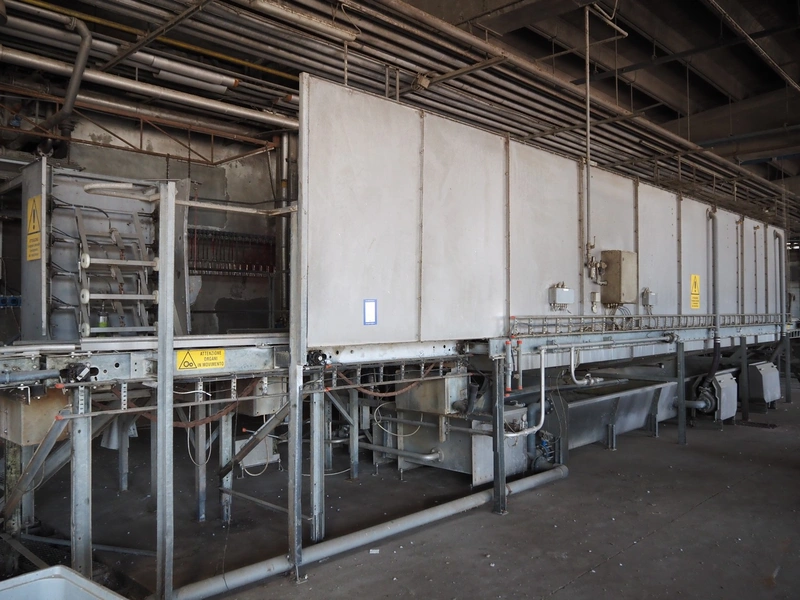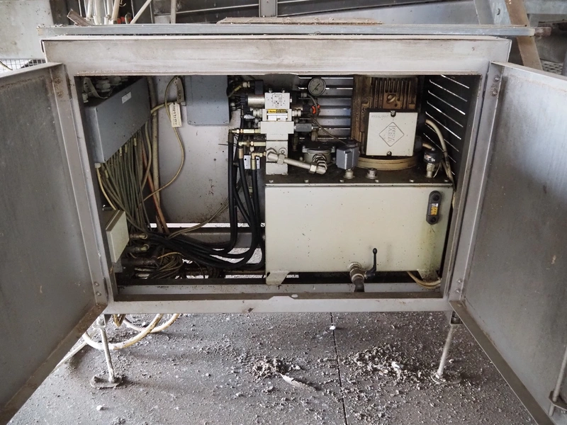 Stork PMT B.V. container supply system with container washer, type: G.P. System, model: 4S, type: 3722814, serial number: 10048897, year of construction: 2005, capacity: 9.000 broilers per hour, maximum live bird weight: 3500 gram, number of containers per hour: 88 pieces, distance between chains: 920 mm, diameter carrousel: 3400 mm, clearance washer: 1240 mm x 1540 mm, dimensions washer: 13200 mm x 2600 mm x 3600 mm, total length: 37570 mm, dimensions switch cabinet: 2400 mm x 600 mm x 2400 mm.