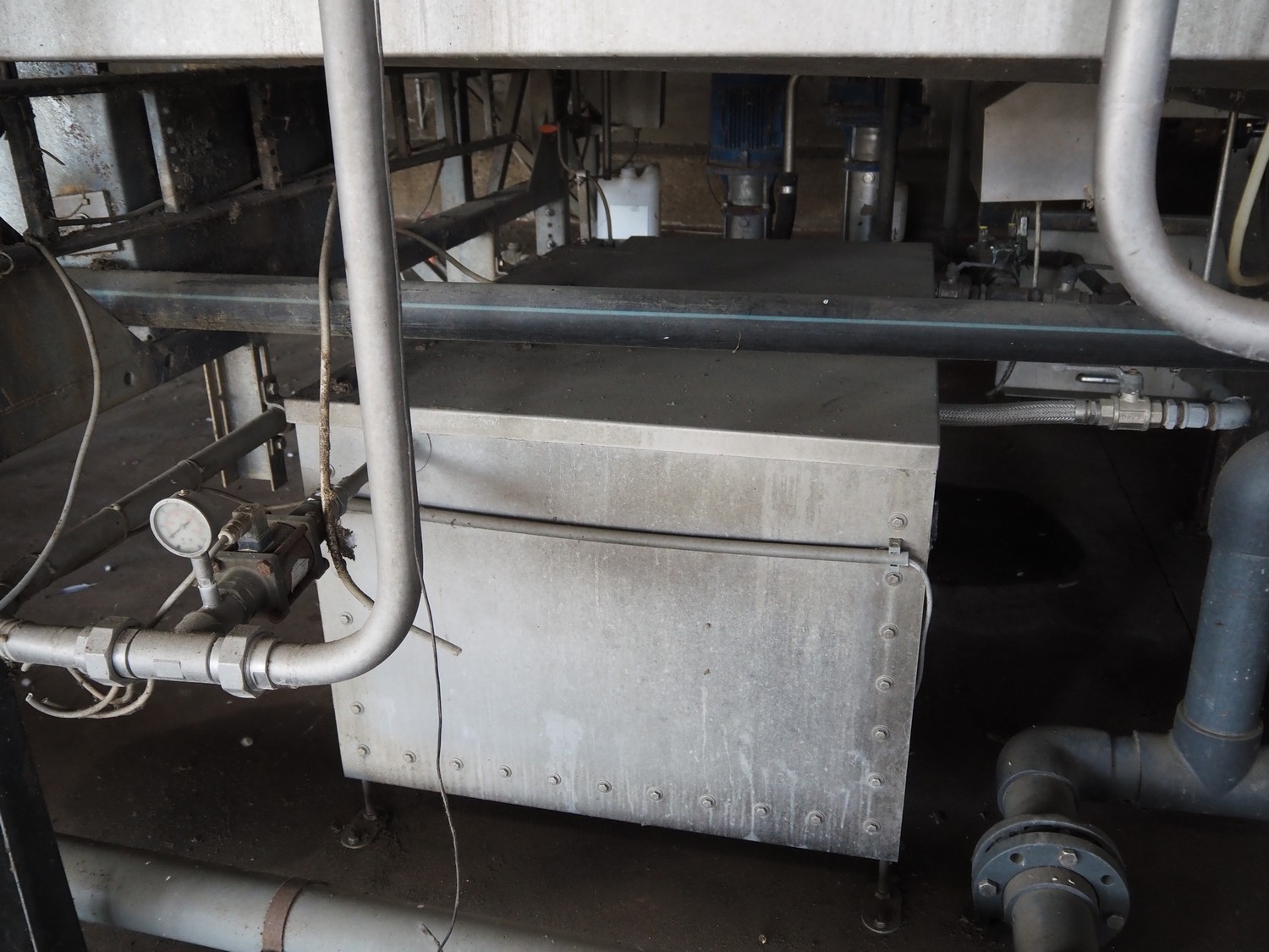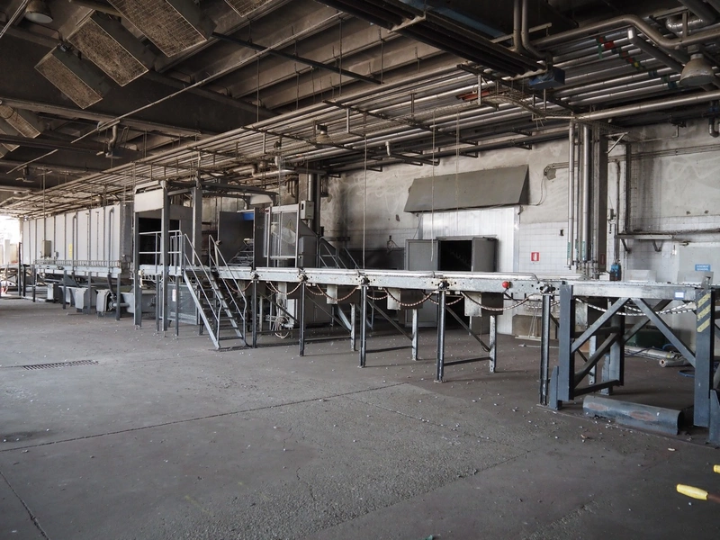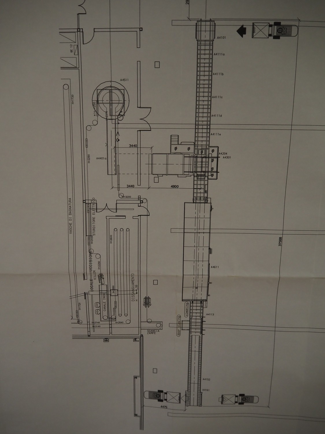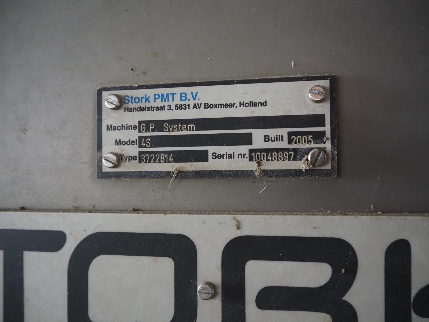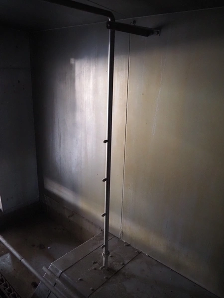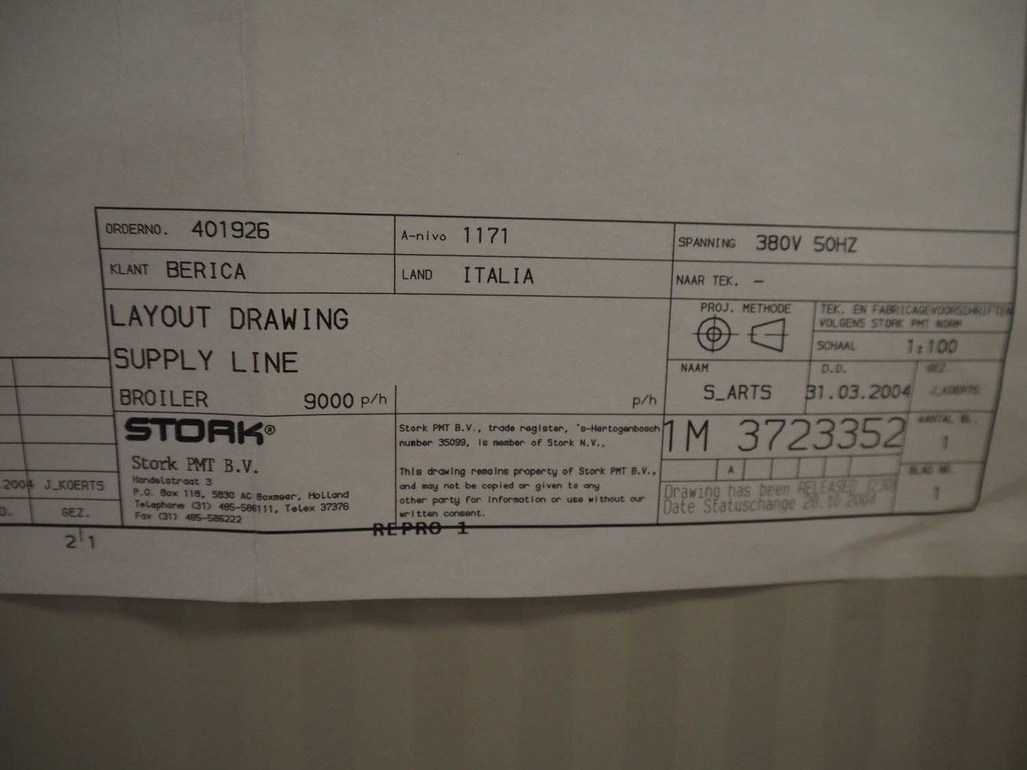 Stork PMT B.V. container supply system with container washer, type: G.P. System, model: 4S, type: 3722814, serial number: 10048897, year of construction: 2005, capacity: 9.000 broilers per hour, maximum live bird weight: 3500 gram, number of containers per hour: 88 pieces, distance between chains: 920 mm, diameter carrousel: 3400 mm, clearance washer: 1240 mm x 1540 mm, dimensions washer: 13200 mm x 2600 mm x 3600 mm, total length: 37570 mm, dimensions switch cabinet: 2400 mm x 600 mm x 2400 mm.