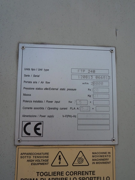 Ambitec BV air handling unit, type: FTP 240, serial number: 120813 066813, 400 V, 3 Ph, 50 Hz, 7.5 kW, weight: 921 kg, air flow: 20000 m³/h, dimensions: 4000 mm x 1800 mm x 1700 mm.