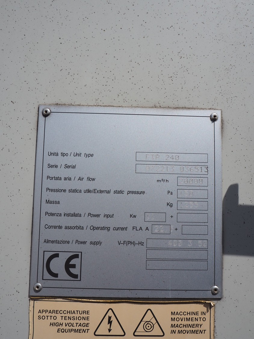 Ambitec BV air handling unit, type: FTP 240, serial number: 072213 036513, 400 V, 3 Ph, 50 Hz, 11 kW, weight: 1255 kg, air flow: 20000 m³/h, dimensions: 4600 mm x 2100 mm x 1800 mm.