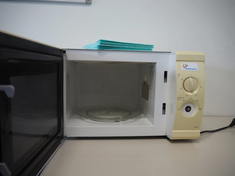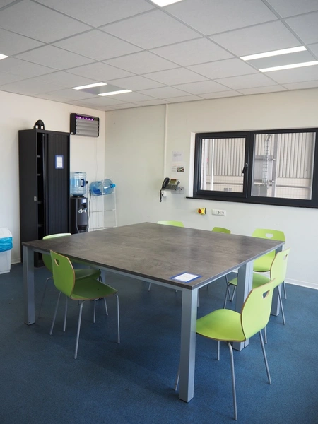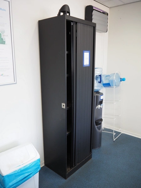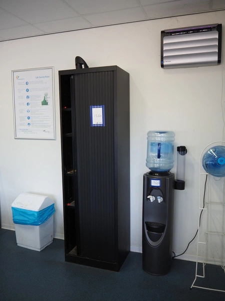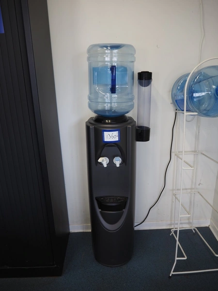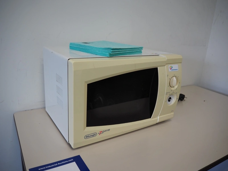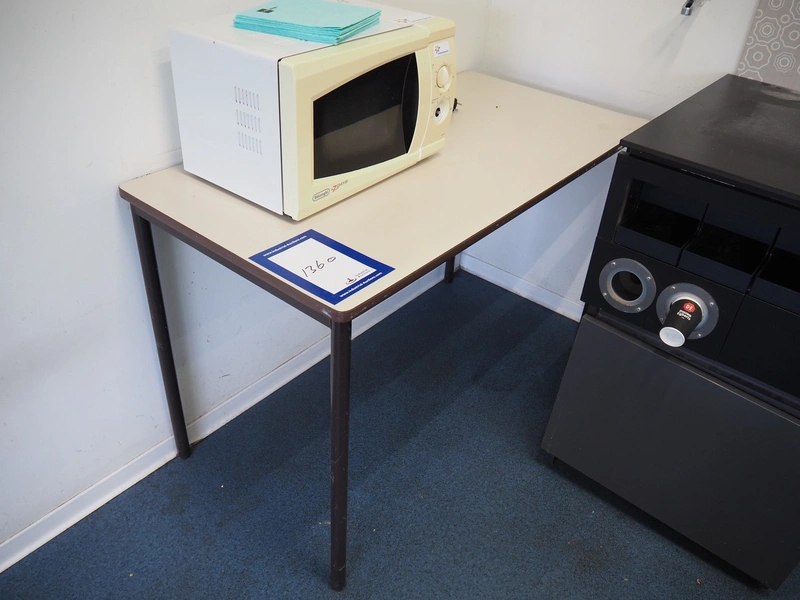 Canteen inventory consisting of 3 tables, dimensions: (2x) 1800 mm x 900 mm x 700 mm, 600 mm x 1200 mm x 750 mm, cabinet, dimensions: 450 mm x 600 mm x 1980 mm, water dispenser, dimensions: 350 mm x 400 mm x 1420 mm, DeLonghi microwave and 7 chairs.