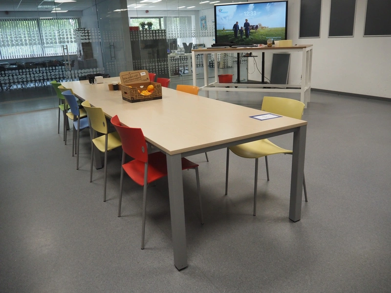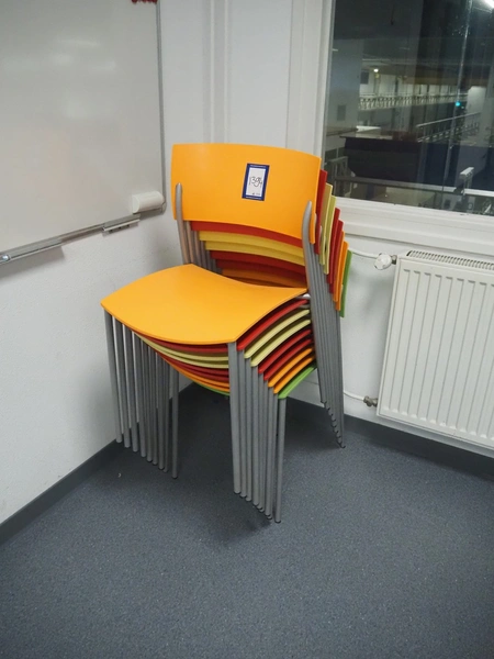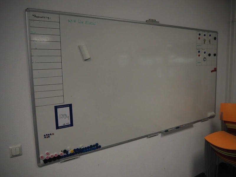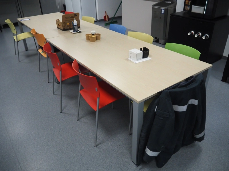 Canteen inventory consisting of 10 tables, dimensions: (2x) 2000 mm x 600 mm x 1110 mm, (2x) 2000 mm x 1000 mm x 750 mm, (6x) 1550 mm x 745 mm x 740 mm, 21 chairs, whiteboard, s/s waste bin, dimensions: 400 mm x 470 mm x 950 mm. Available from December 2025.
