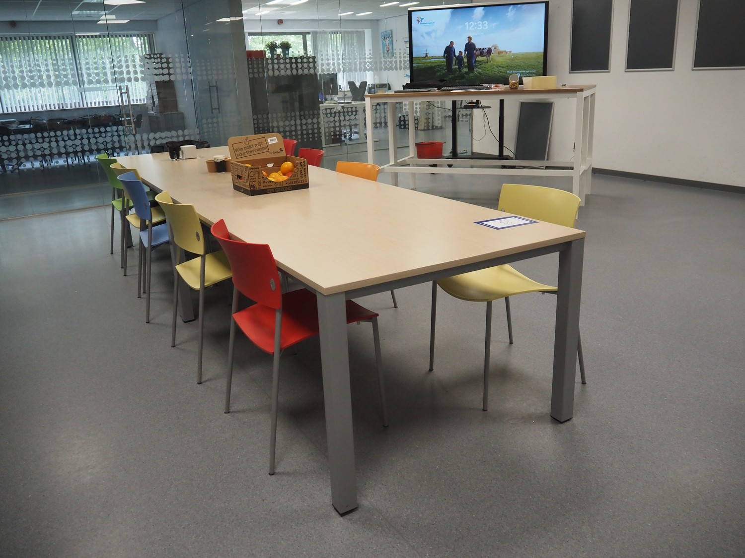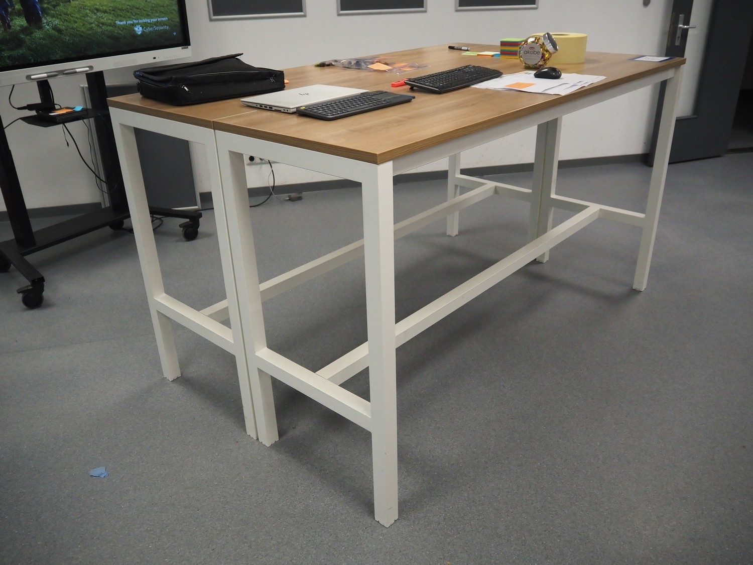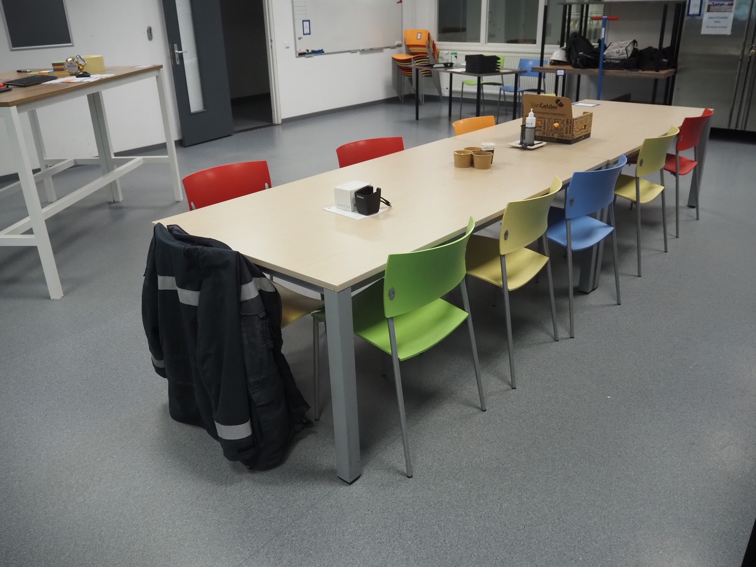Canteen inventory consisting of 10 tables, dimensions: (2x) 2000 mm x 600 mm x 1110 mm, (2x) 2000 mm x 1000 mm x 750 mm, (6x) 1550 mm x 745 mm x 740 mm, 21 chairs, whiteboard, s/s waste bin, dimensions: 400 mm x 470 mm x 950 mm. Available from December 2025.