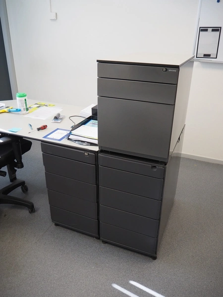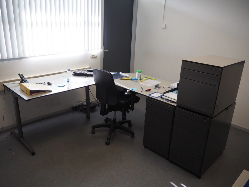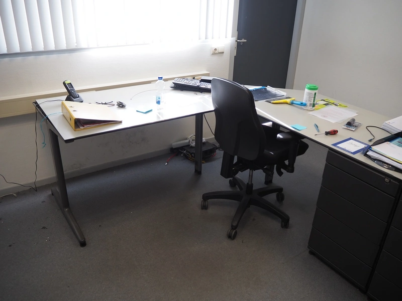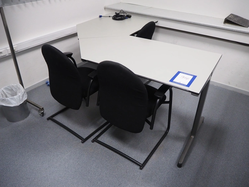 Office inventory, consisting of: 3 desks, dimensions: (2x) 1800 mm x 1600 mm x 770 mm and (1x) 1800 mm x 900 mm x 770 mm, 6 chairs, 1 meeting table, dimensions: 2000 mm x 1200 mm x 1100 mm, 1 whiteboard, 1 tv and 4 cabinets, dimensions: (3x) 750 mm x 430 mm x 530 mm and (1x) 1200 mm x 430 mm x 780 mm.
