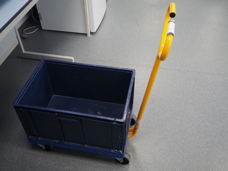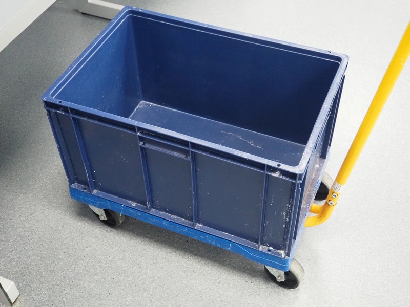 Steel trolley with plastic crate, dimensions: 750 mm x 400 mm x 950 mm.