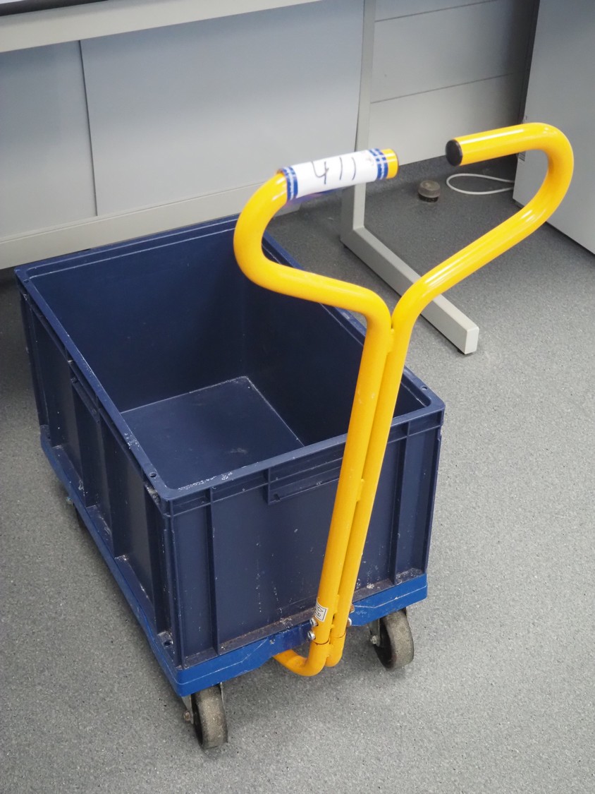 Steel trolley with plastic crate, dimensions: 750 mm x 400 mm x 950 mm.