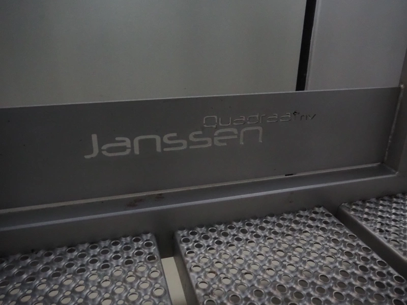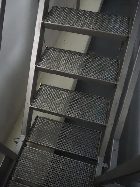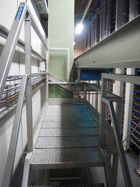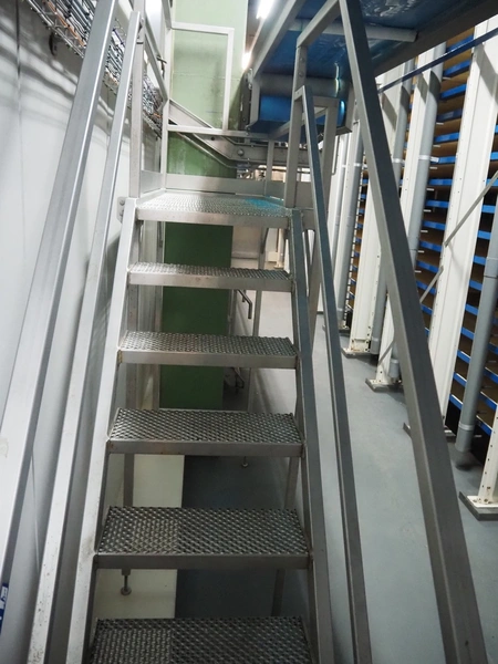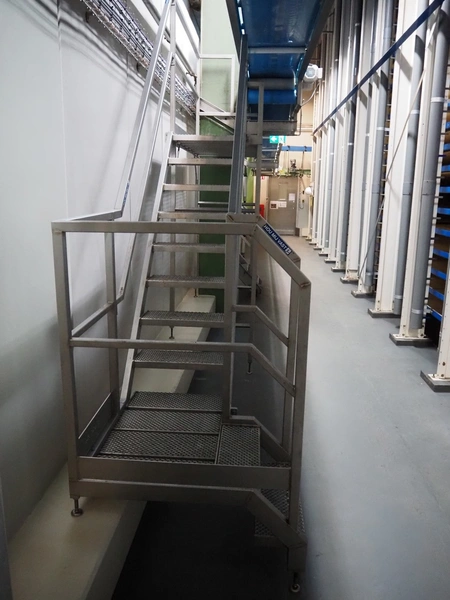 Janssen Quadraat nv s/s platform with stairs, working height: 2100 mm, total dimensions: 4450 mm x 1000 mm x 2570 mm.