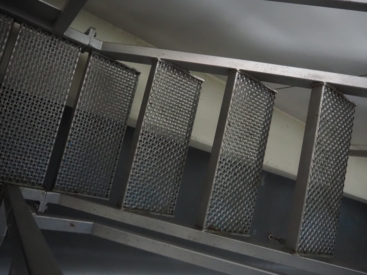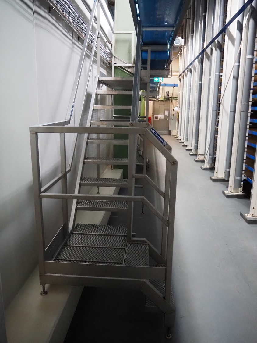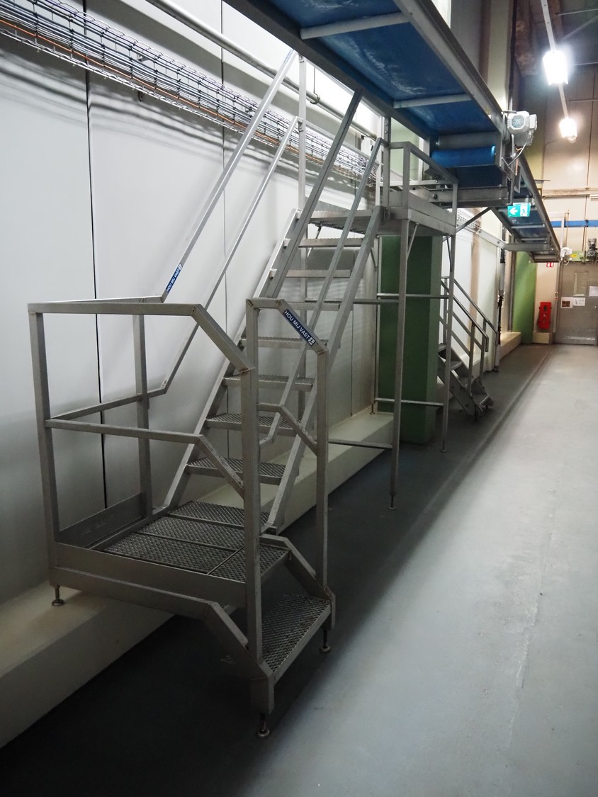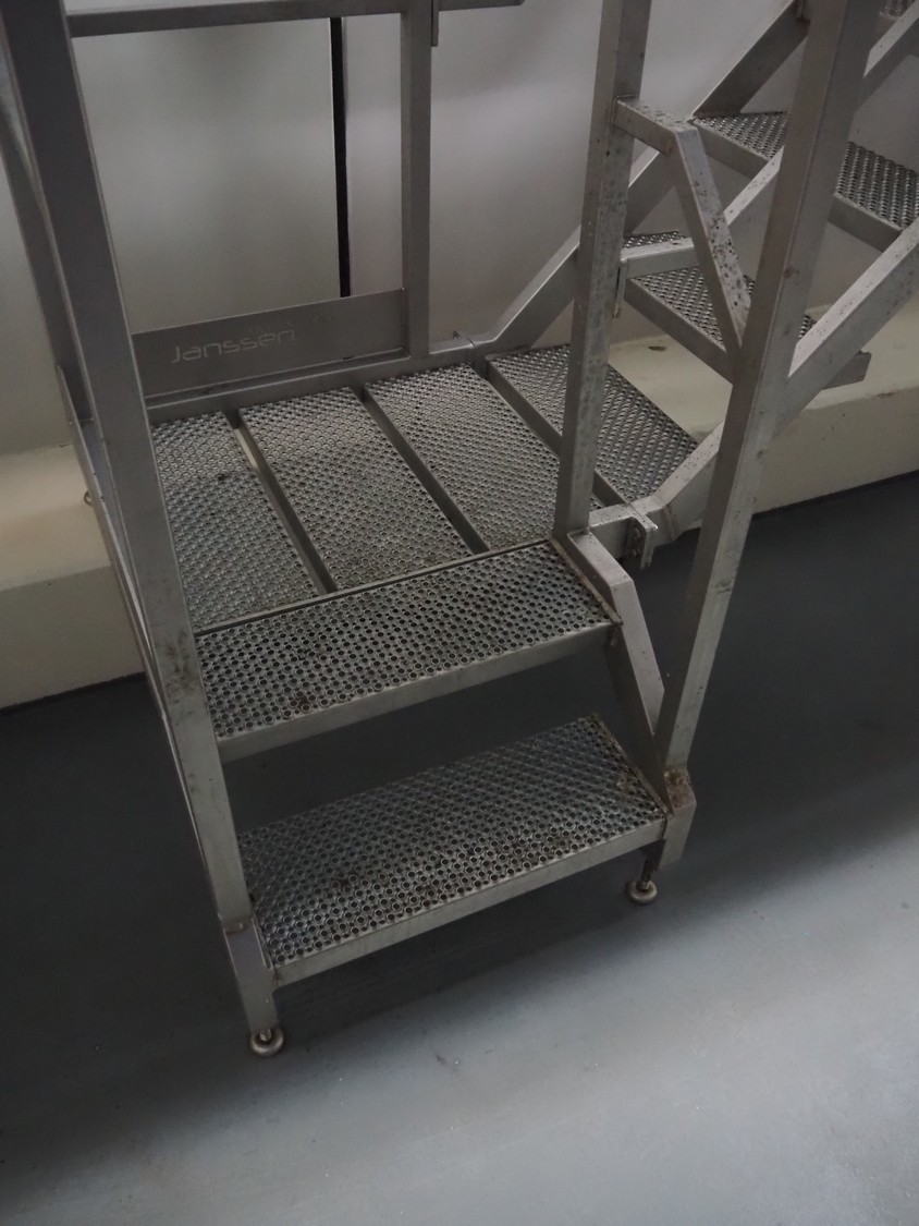 Janssen Quadraat nv s/s platform with stairs, working height: 2100 mm, total dimensions: 4450 mm x 1000 mm x 2570 mm.