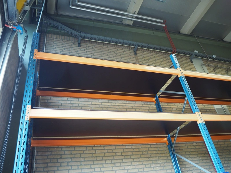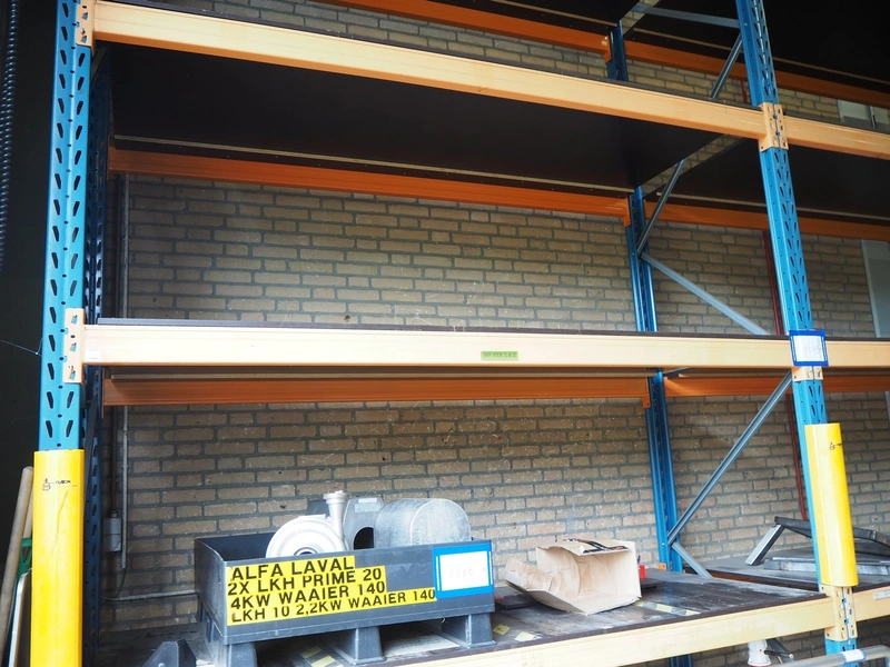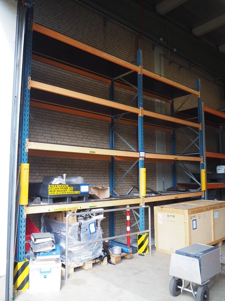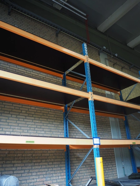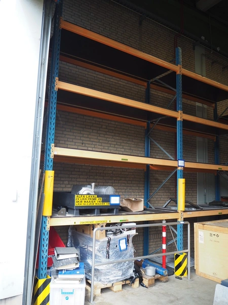 Steel pallet rack, consisting of: 3 uprights and 16 beams, dimensions uprights: (3x) 1100 mm x 4500 mm, beam width: (16x) 3300 mm.