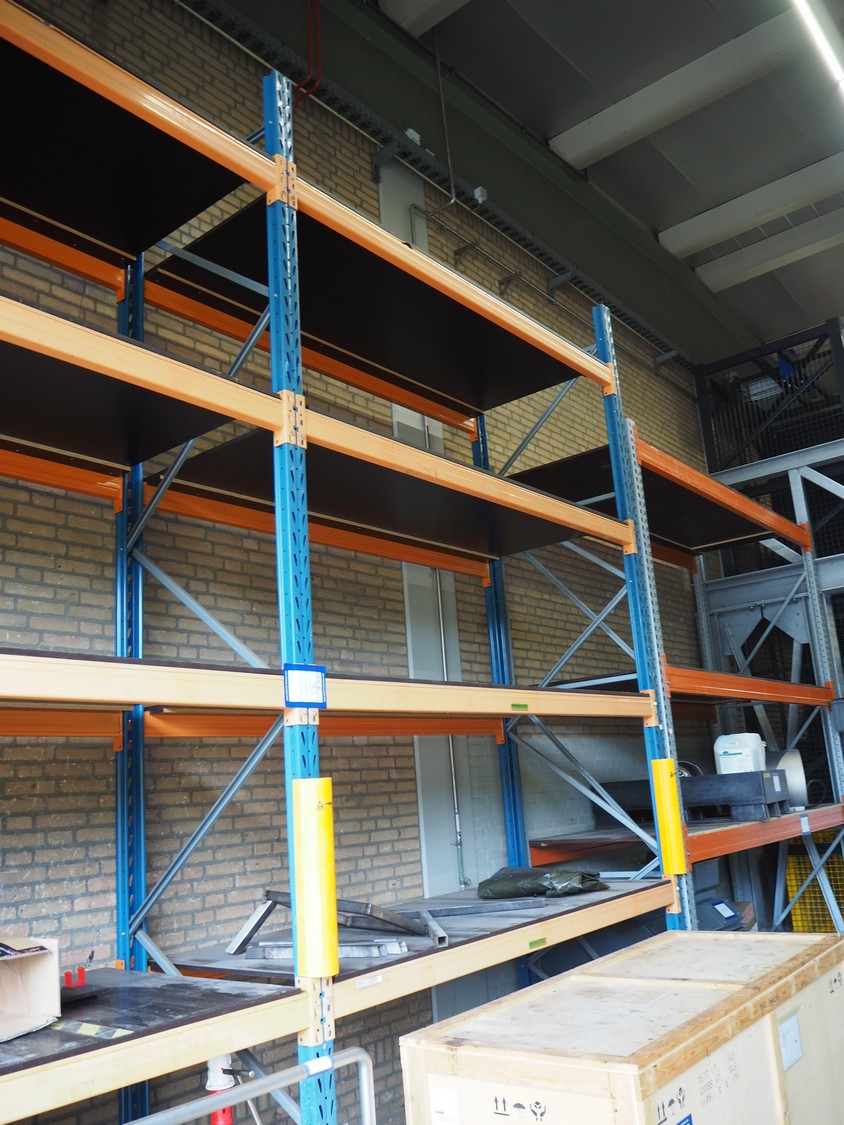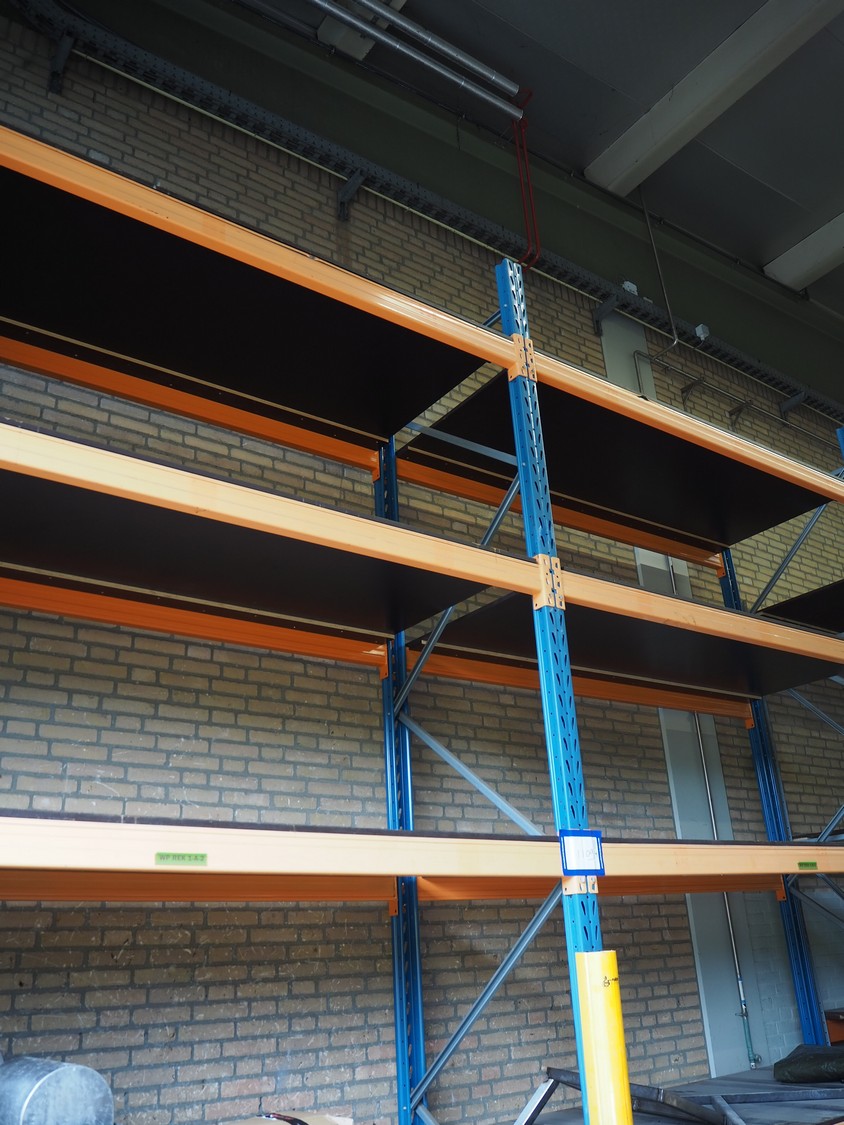 Steel pallet rack, consisting of: 3 uprights and 16 beams, dimensions uprights: (3x) 1100 mm x 4500 mm, beam width: (16x) 3300 mm.