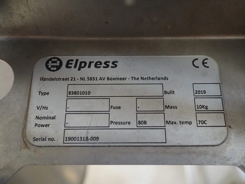 Elpress soap mixing station, type: 83801010, serial number: 19001318-009, year of construction: 2019, pressure: 80 bar, maximum temperature: 70°C, dimensions: 100 mm x 400 mm x 450 mm, 430 mm x 520 mm x 600 mm.