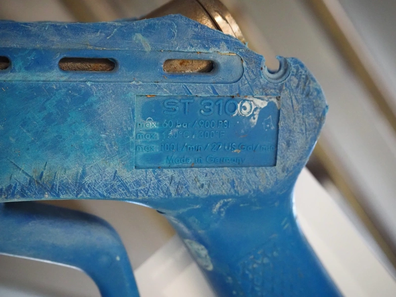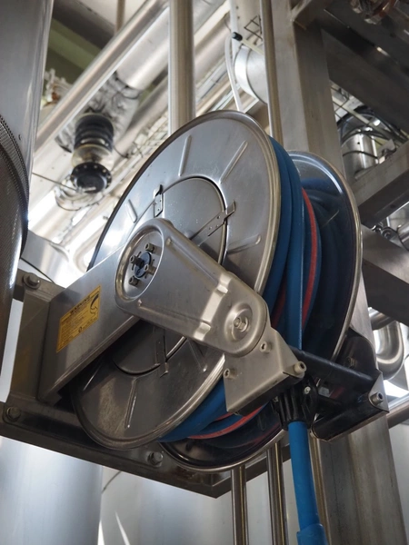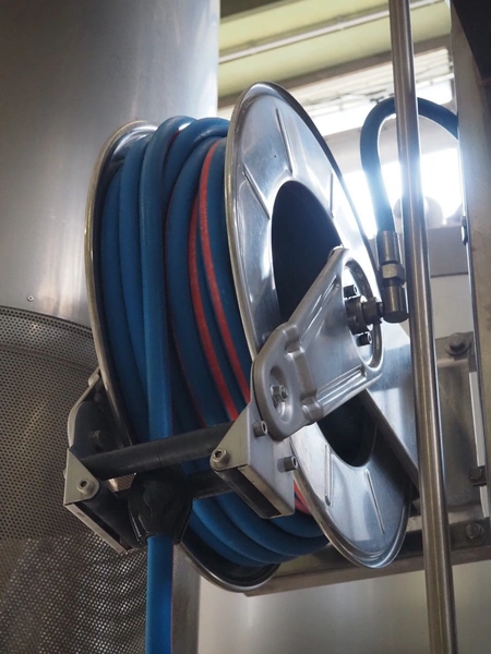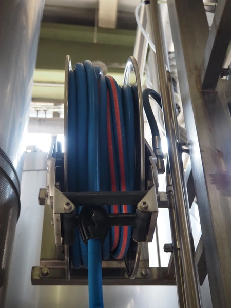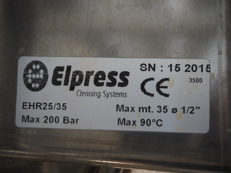 Elpress s/s hose reel with plastic hose and spray pistol, type: EHR25/35, serial number: 15 2015, dimensions: 550 mm x 320 mm x 600 mm.
