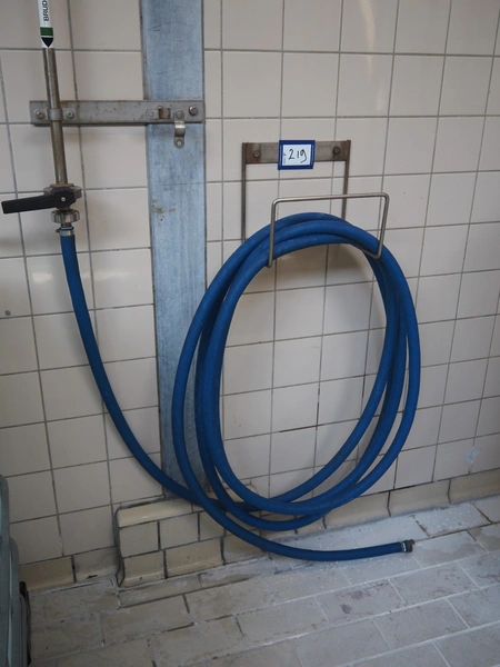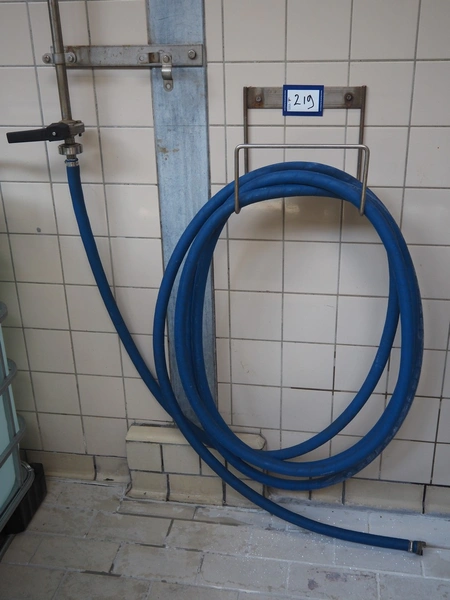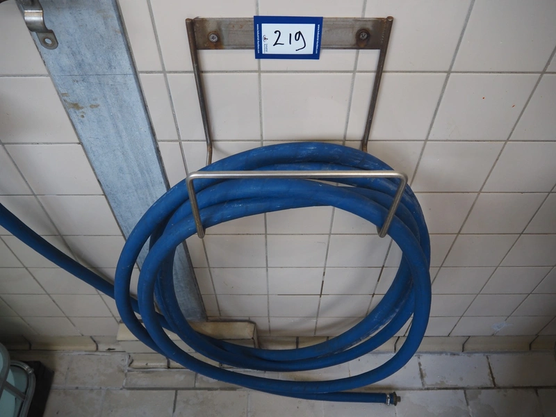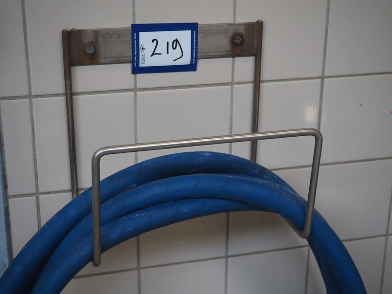 S/s hose reel with plastic hose, dimensions: 220 mm x 300 mm x 270 mm.
