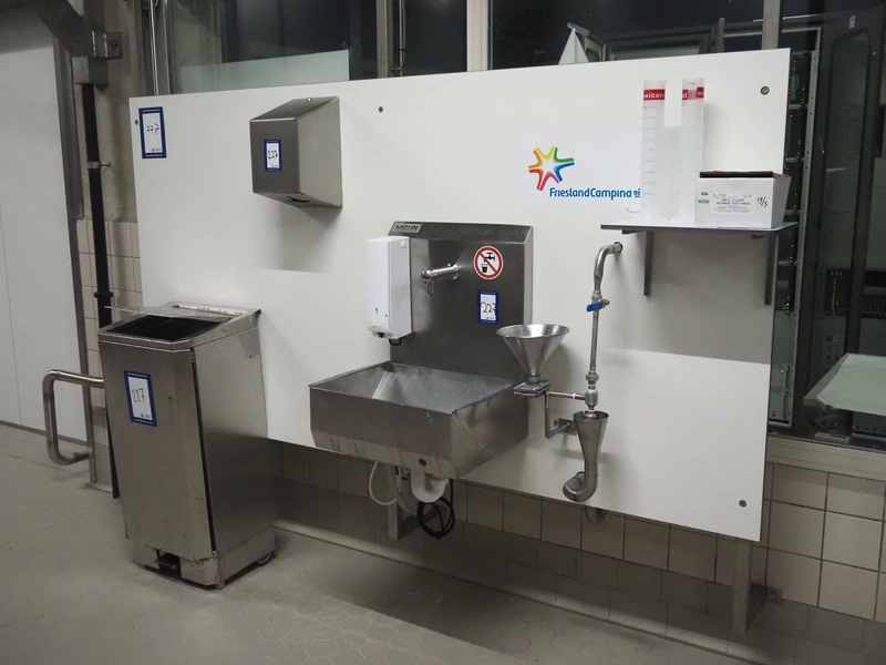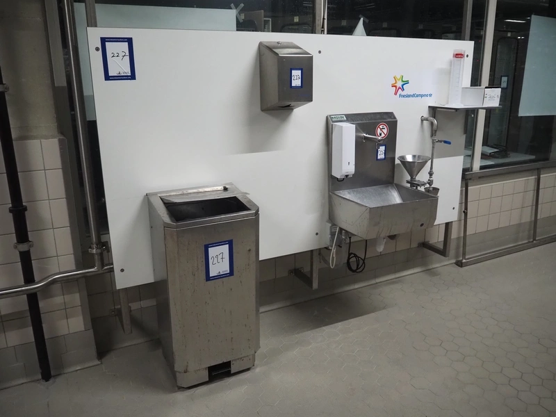 S/s frame with Mohn s/s sink sensor control, CWS plastic soap dispenser, sensor control, Initial Hokatex s/s paper dispenser and s/s waste bin, dimensions: 2500 mm x 1820 mm.