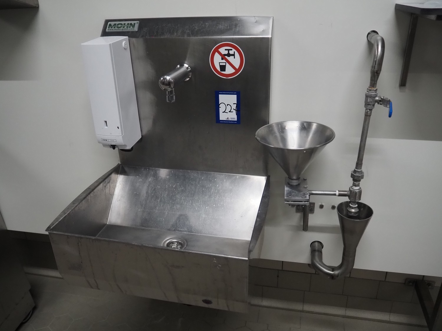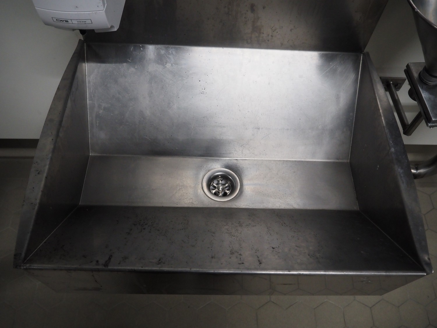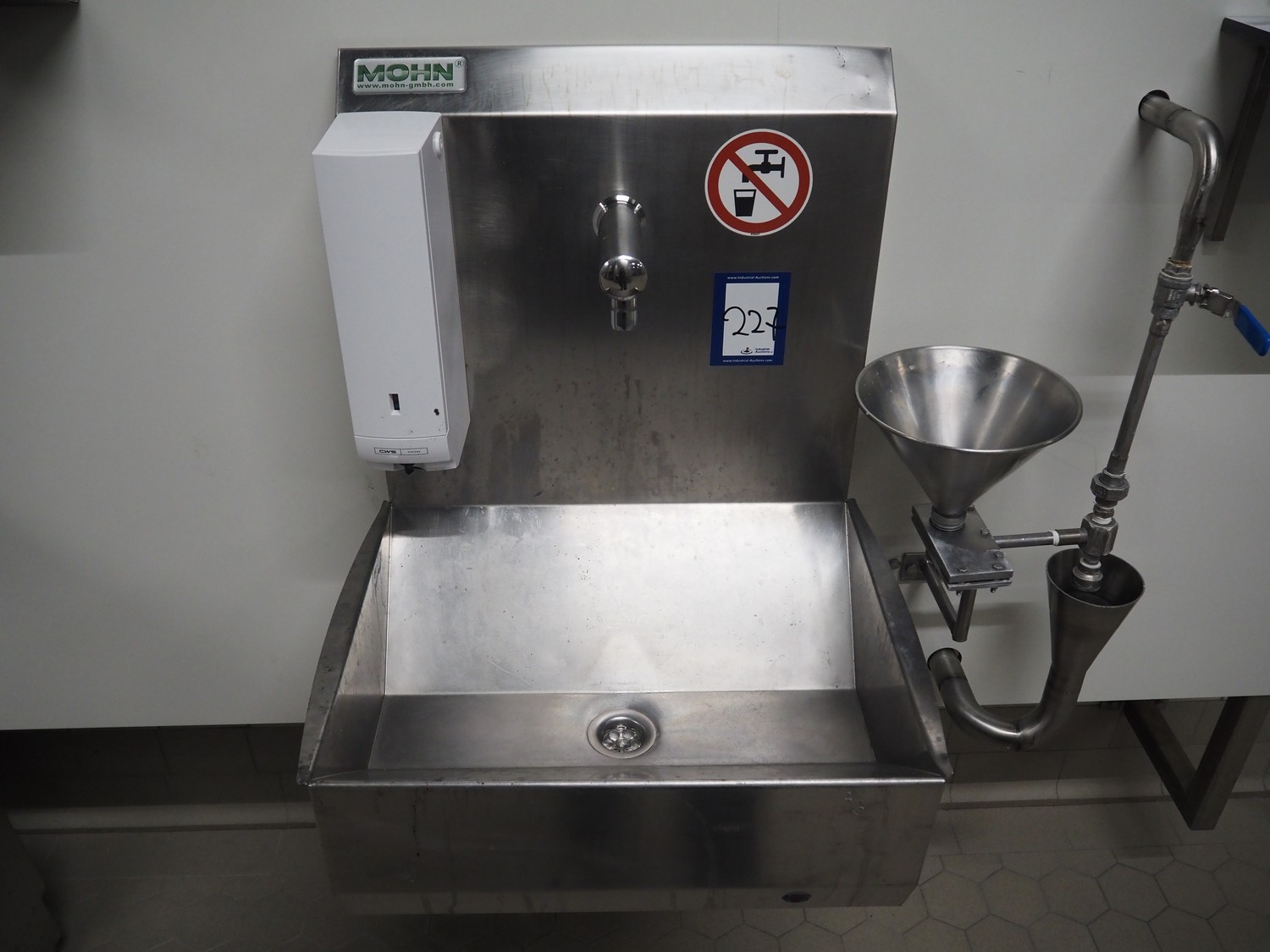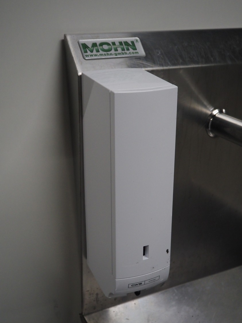 S/s frame with Mohn s/s sink sensor control, CWS plastic soap dispenser, sensor control, Initial Hokatex s/s paper dispenser and s/s waste bin, dimensions: 2500 mm x 1820 mm.
