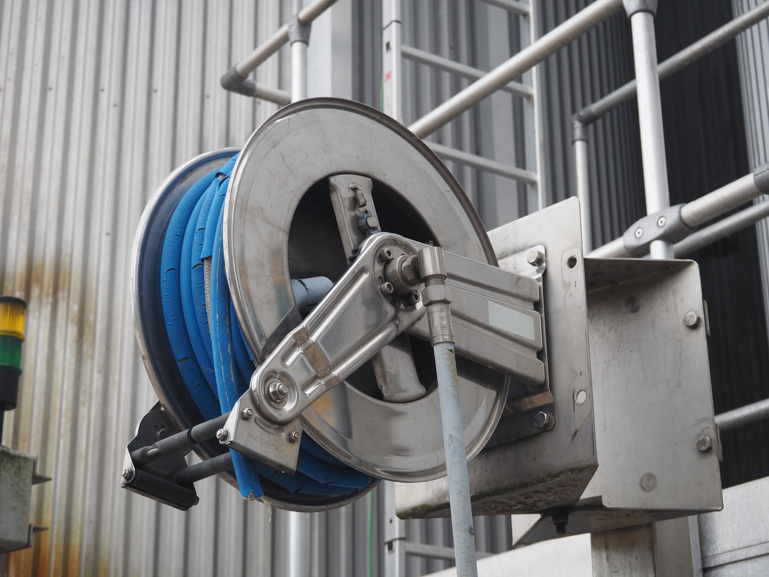 Elpress s/s hose reel with plastic hose, dimensions: 460 mm x 250 mm x 500 mm.