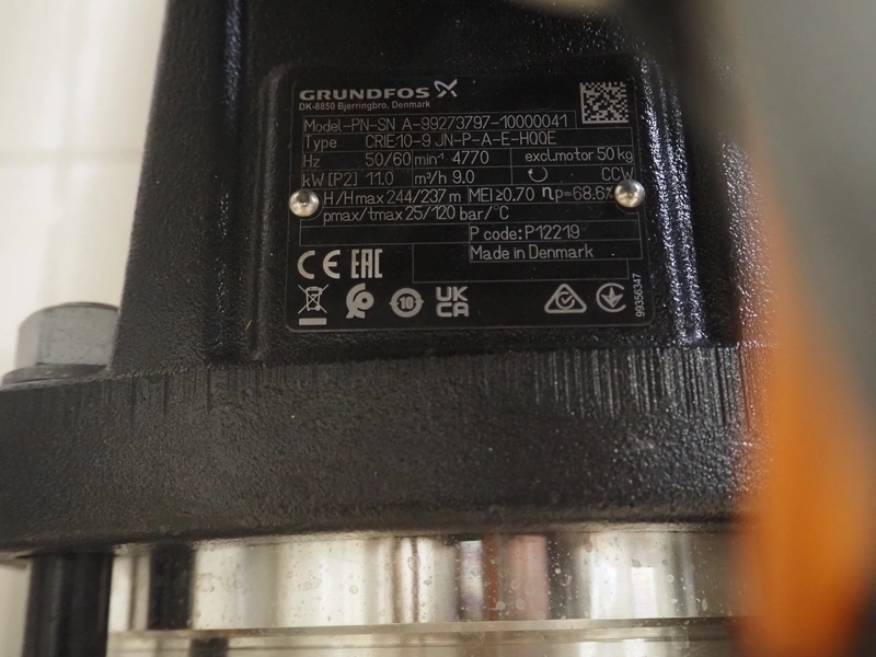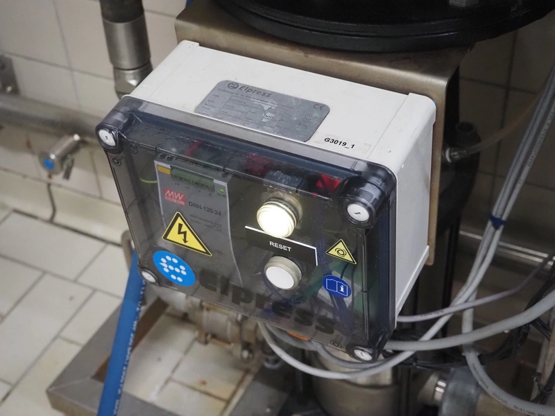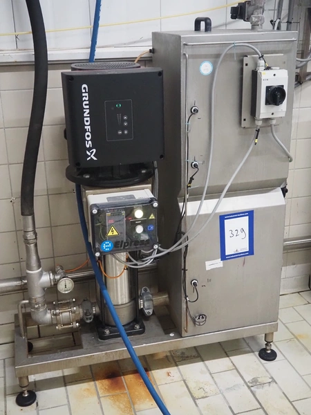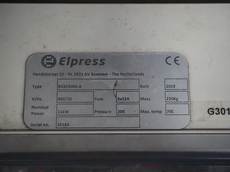 Elpress high-pressure cleaning system, type: 83303004-A, serial number: 32184, year of construction: 2019, 400 V, 3 Ph, 50 Hz, 11 kW, maximum temperature: 70 °C, weight: 220 kg, Grundfos circulation pump, type: CRIE10-9 JN-P-A-E-HQQE, 11.0 kW, 9.0 m³ per hour, dimensions: 500 mm x 1200 mm x 1500 mm.