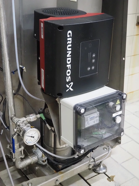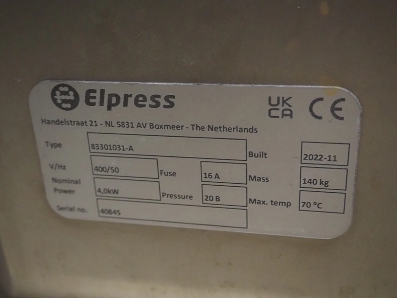 Elpress booster unit, type: 83301031-A, serial number: 40845, year of construction: 2022, 400 V, 50 Hz, 4.0 kW, 16 A, maximum temperature: 70 °C, weight: 140 kg, Grundfos circulation pump, type: CRIE 3-9 JN-P-A-E-HQQE, 4.0 kW, capacity: 3.5 m³ per hour, dimensions: 600 mm x 730 mm x 1500 mm.