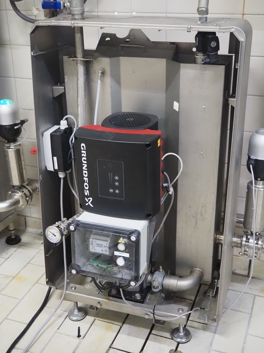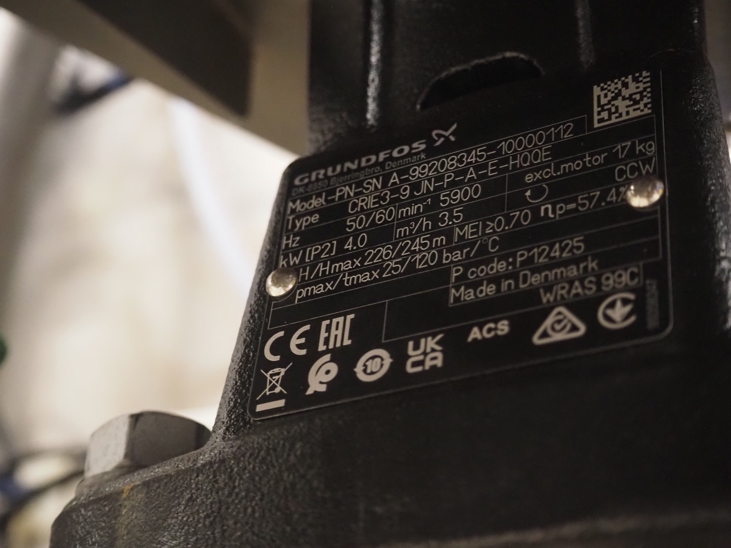 Elpress booster unit, type: 83301031-A, serial number: 40845, year of construction: 2022, 400 V, 50 Hz, 4.0 kW, 16 A, maximum temperature: 70 °C, weight: 140 kg, Grundfos circulation pump, type: CRIE 3-9 JN-P-A-E-HQQE, 4.0 kW, capacity: 3.5 m³ per hour, dimensions: 600 mm x 730 mm x 1500 mm.