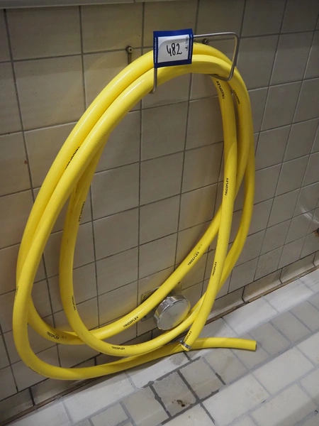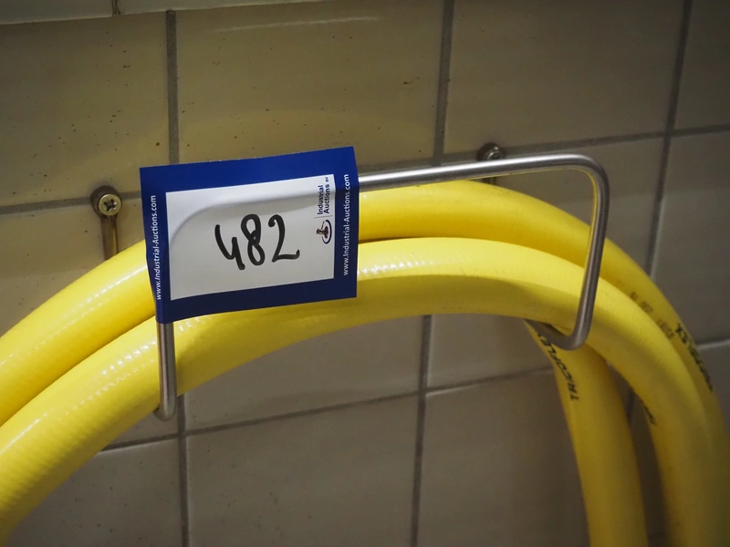 S/s hose reel with plastic hose, dimensions: 130 mm x 230 mm x 120 mm.