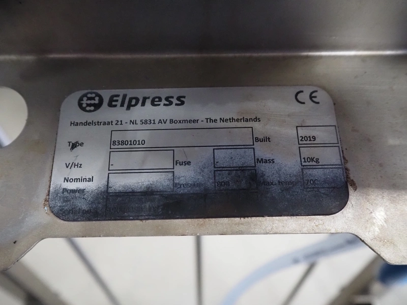 Elpress soap mixing station, type: 83801010, year of construction: 2019, pressure: 80 bar, maximum temperature: 70°C, dimensions: 100 mm x 400 mm x 450 mm, 430 mm x 520 mm x 600 mm.