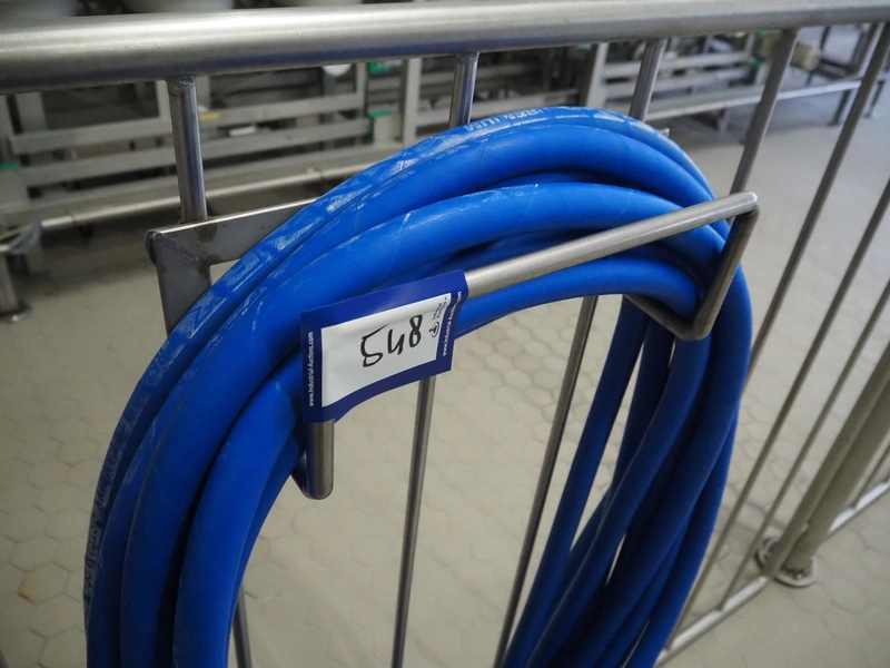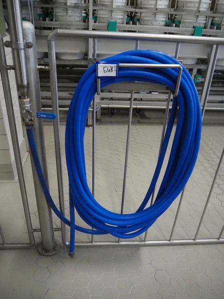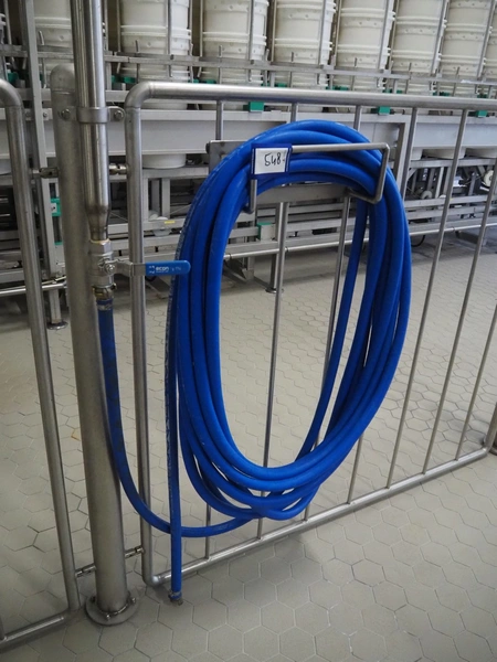 S/s hose reel with plastic hose, dimensions: 160 mm x 440 mm x 170 mm.