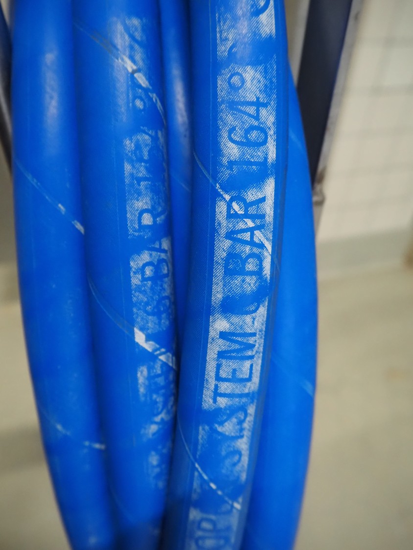 S/s hose reel with plastic hose, dimensions: 160 mm x 440 mm x 170 mm.
