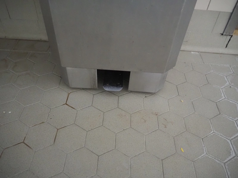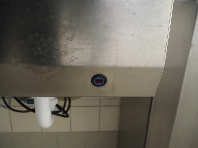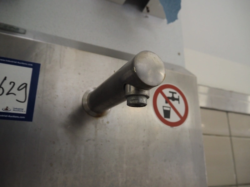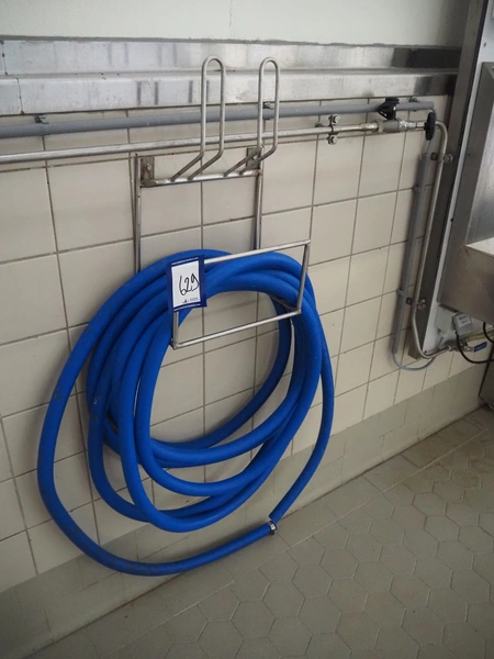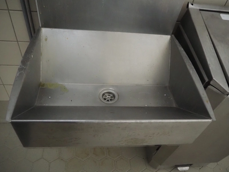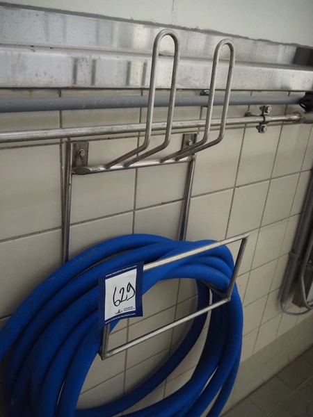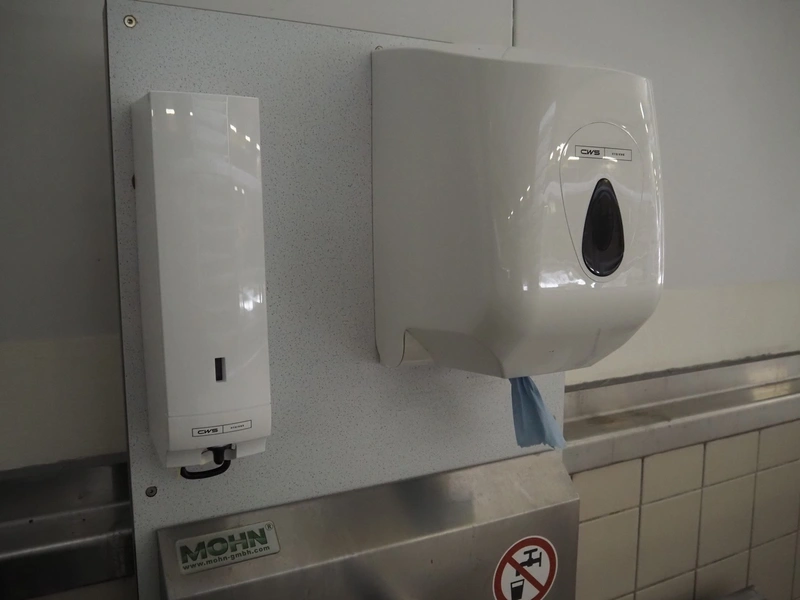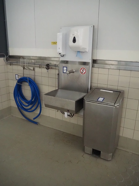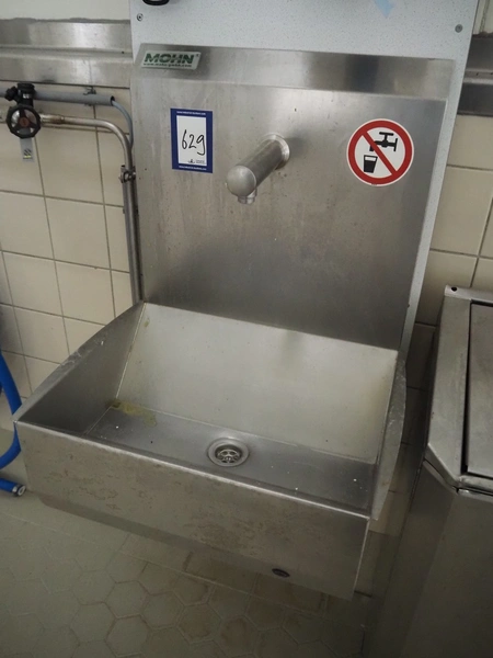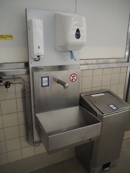 Wooden board with Mohn s/s sink, sensor control, CWS plastic paper dispenser, CWS plastic soap dispenser, s/s waste bin and s/s hose reel with plastic hose, dimensions: 540 mm x 500 mm x 1360 mm, 400 mm x 470 mm x 900 mm, 180 mm x 300 mm x 520 mm.