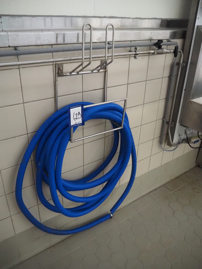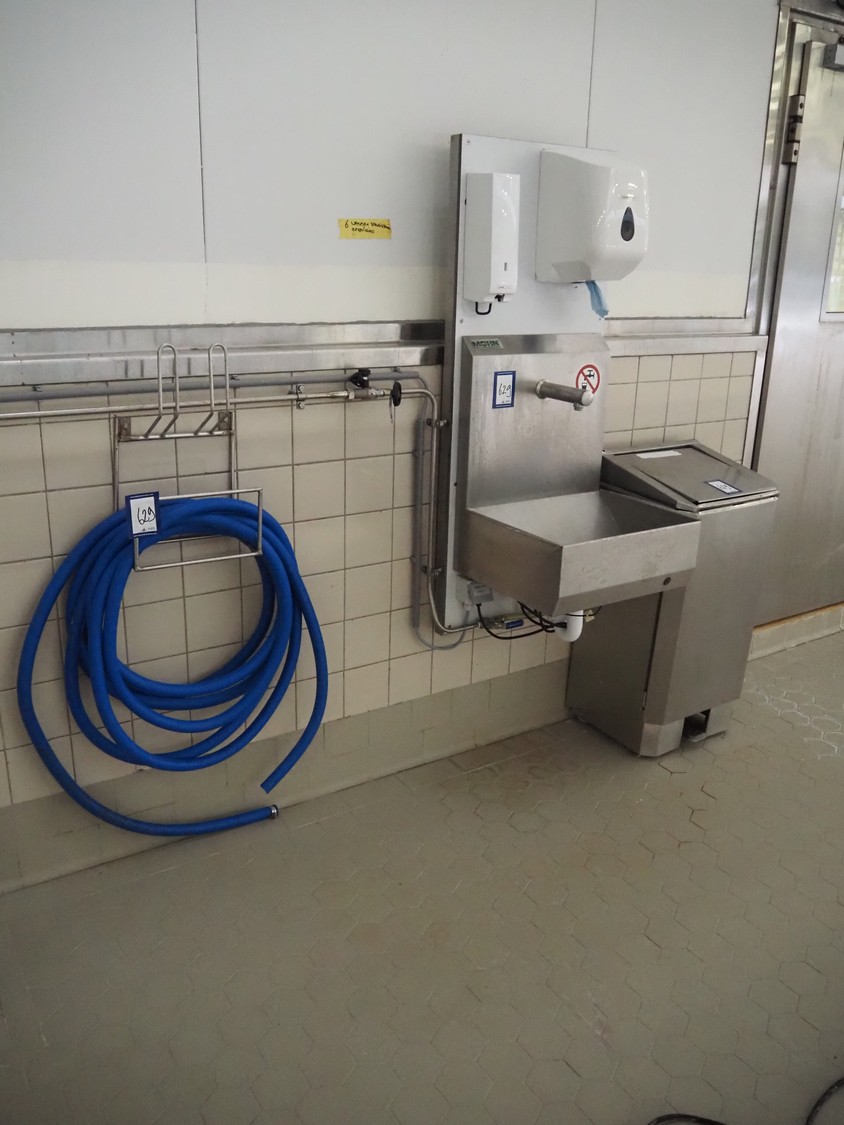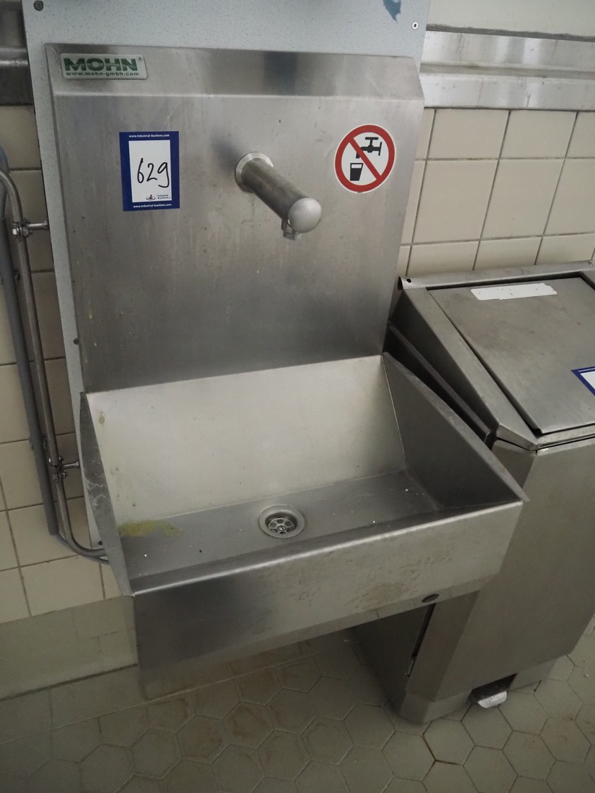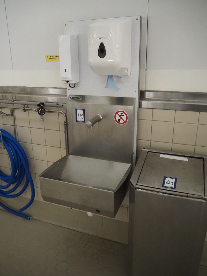 Wooden board with Mohn s/s sink, sensor control, CWS plastic paper dispenser, CWS plastic soap dispenser, s/s waste bin and s/s hose reel with plastic hose, dimensions: 540 mm x 500 mm x 1360 mm, 400 mm x 470 mm x 900 mm, 180 mm x 300 mm x 520 mm.