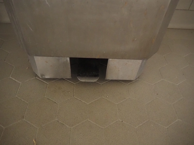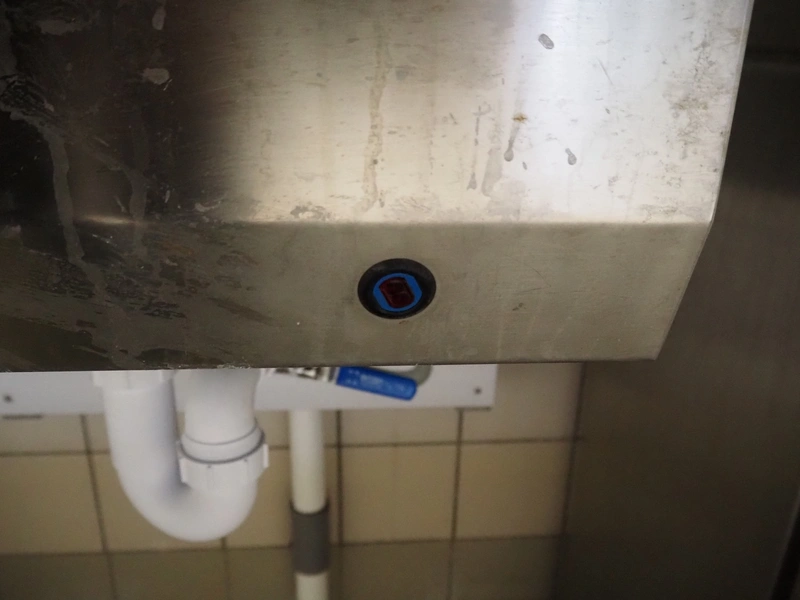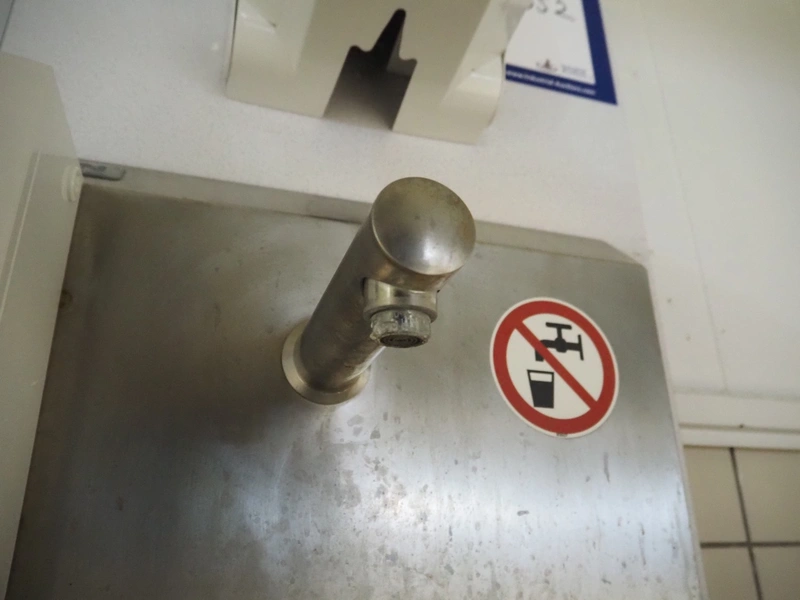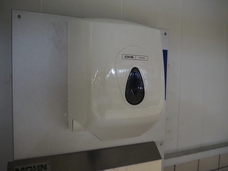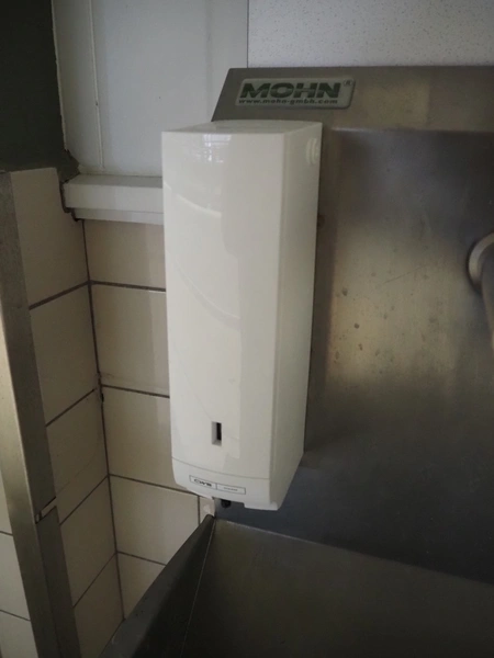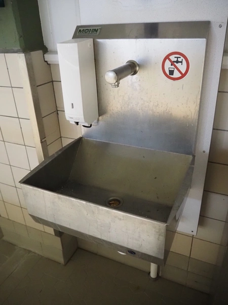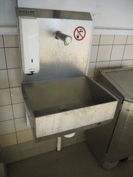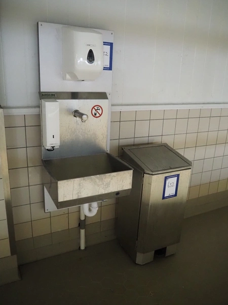 Wooden board with Mohn s/s sink, sensor control, CWS plastic paper dispenser, CWS plastic soap dispenser and s/s waste bin, dimensions: 540 mm x 500 mm x 1360 mm.
