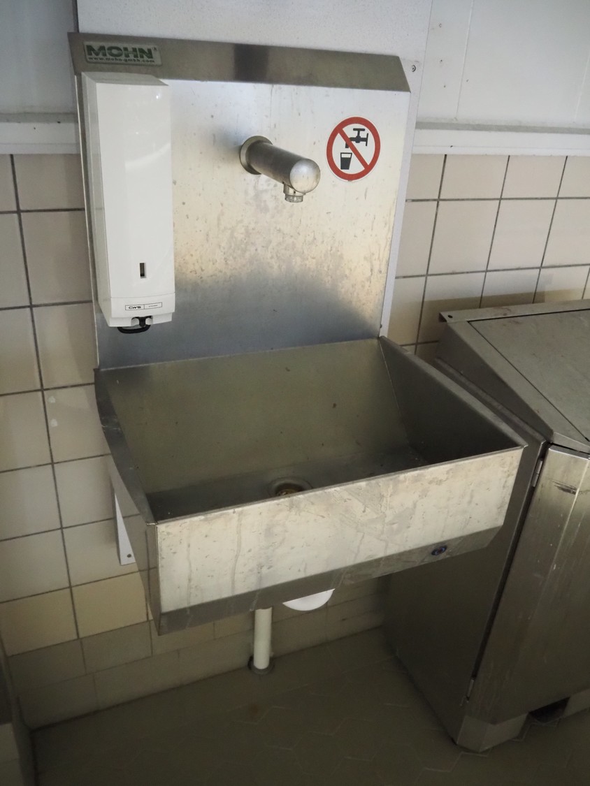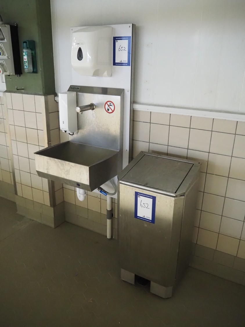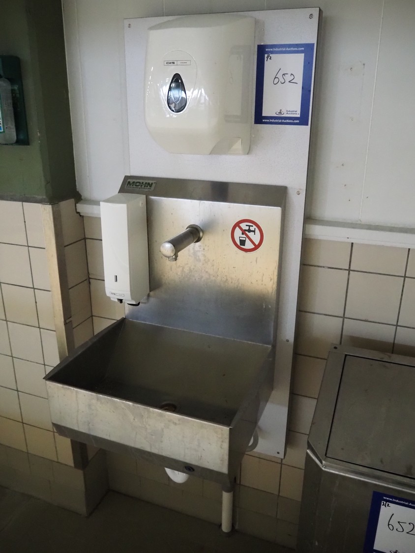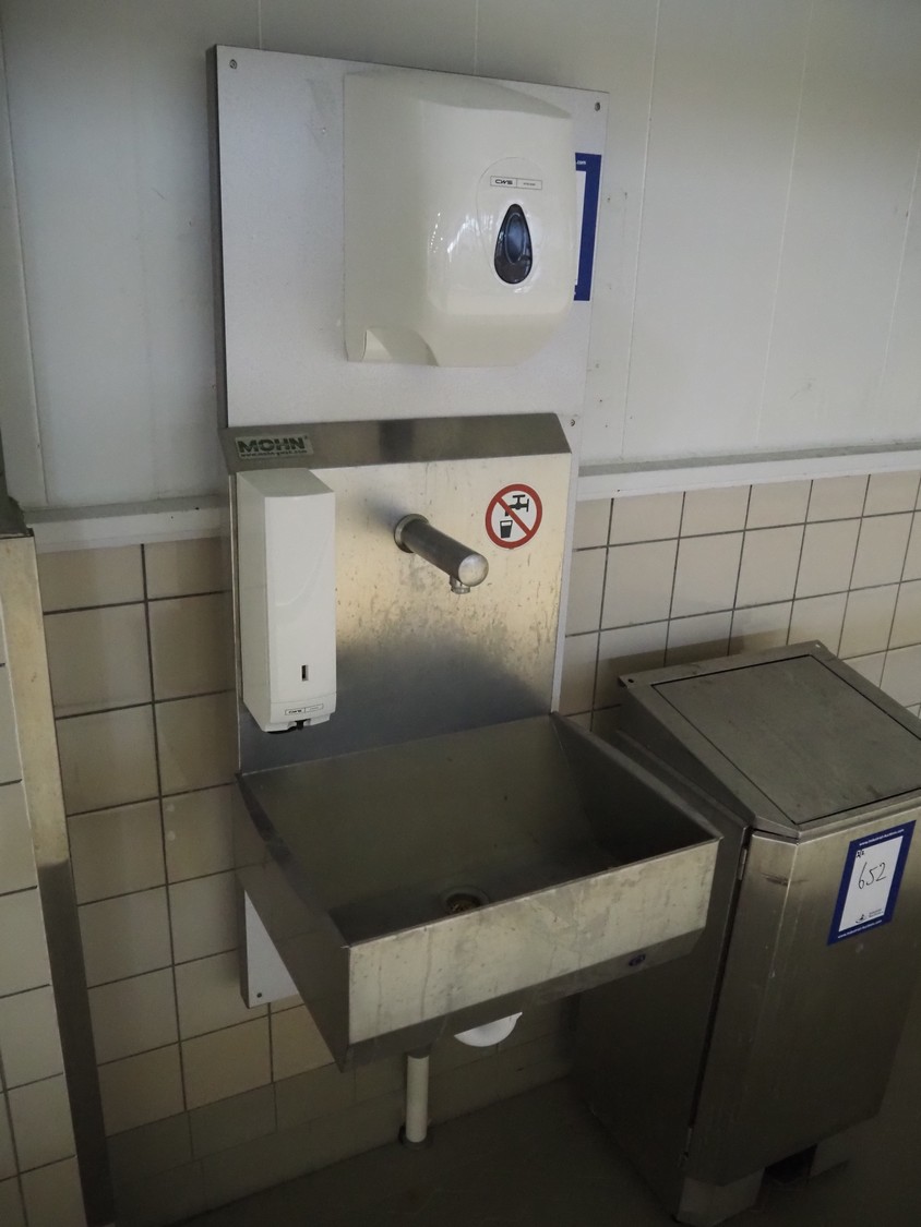 Wooden board with Mohn s/s sink, sensor control, CWS plastic paper dispenser, CWS plastic soap dispenser and s/s waste bin, dimensions: 540 mm x 500 mm x 1360 mm.