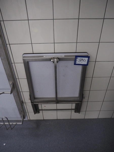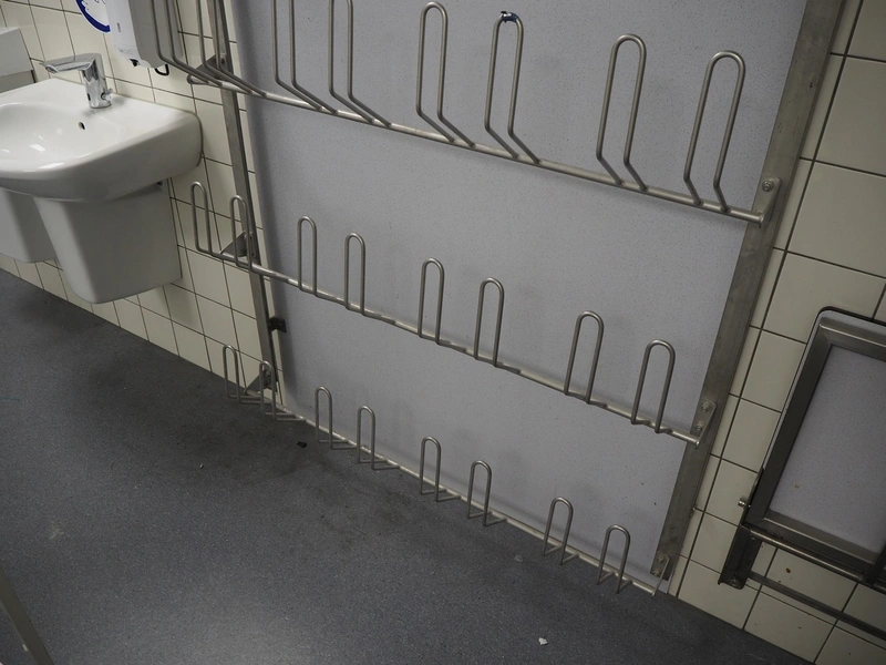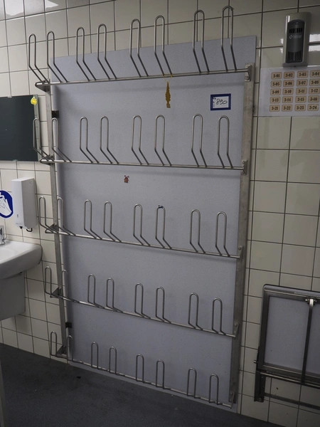S/s wall mounted boot rack for 20 pairs of boots, dimensions: 1150 mm x 250 mm x 2000 mm. With wall mounted foldable chair.