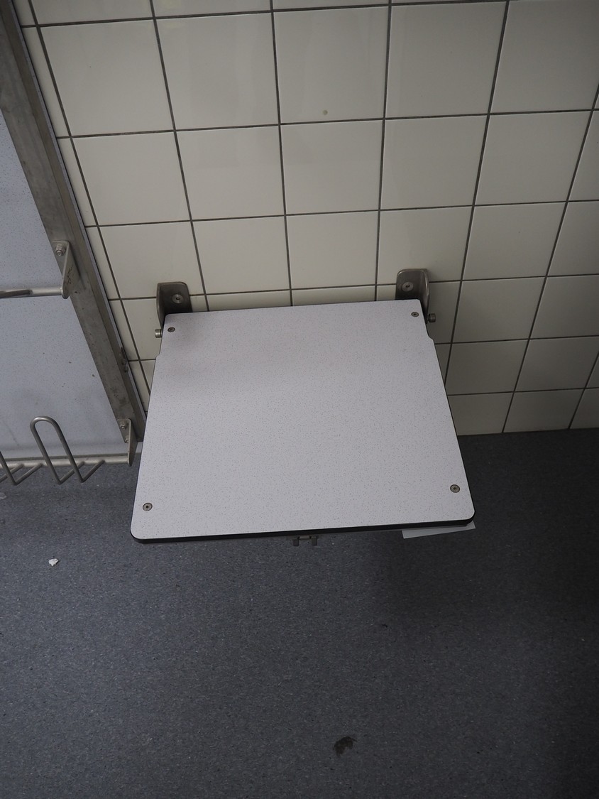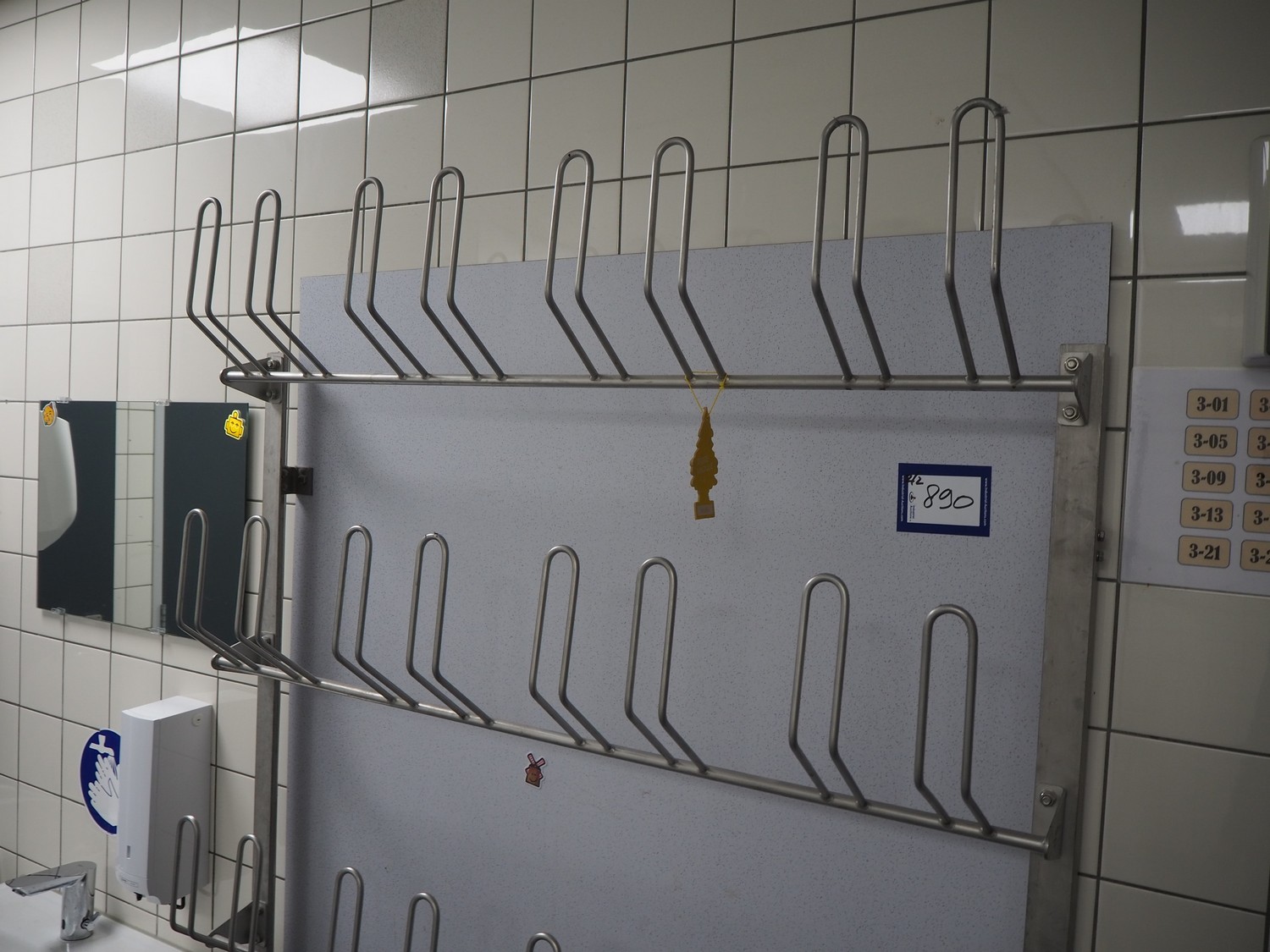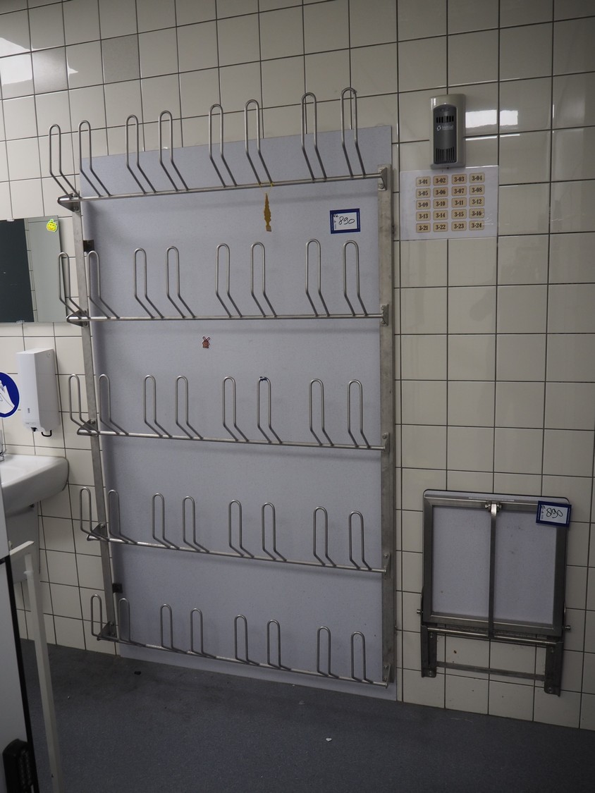 S/s wall mounted boot rack for 20 pairs of boots, dimensions: 1150 mm x 250 mm x 2000 mm. With wall mounted foldable chair.
