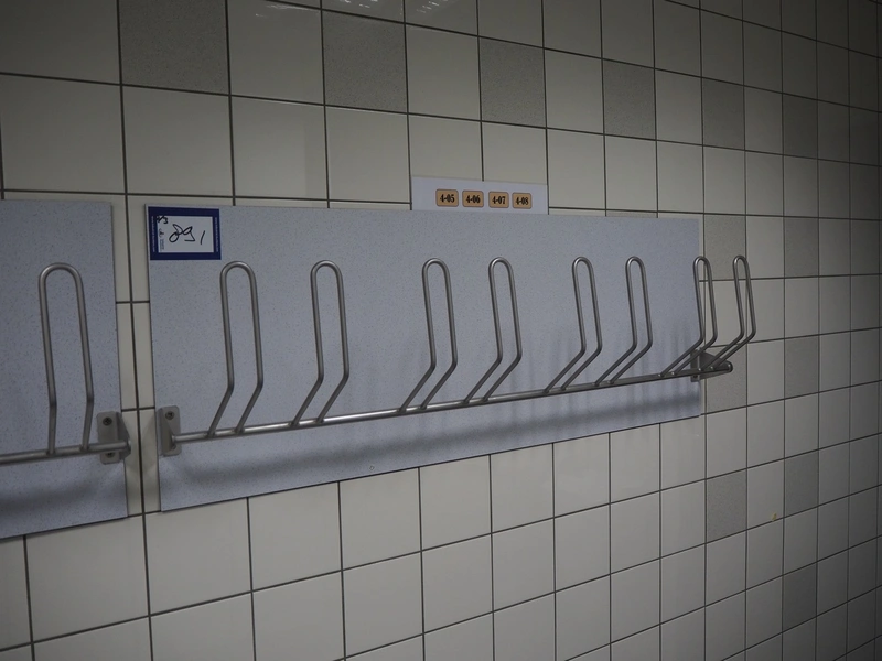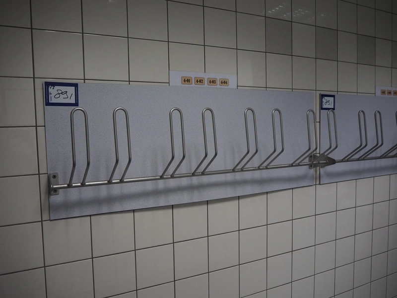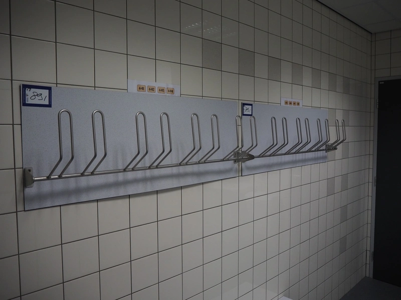 2 s/s wall mounted boot racks for 4 pairs of boots each, dimensions: (2x) 1150 mm x 180 mm x 250 mm. Including bench, dimensions: 1000 mm x 340 mm x 420 mm.