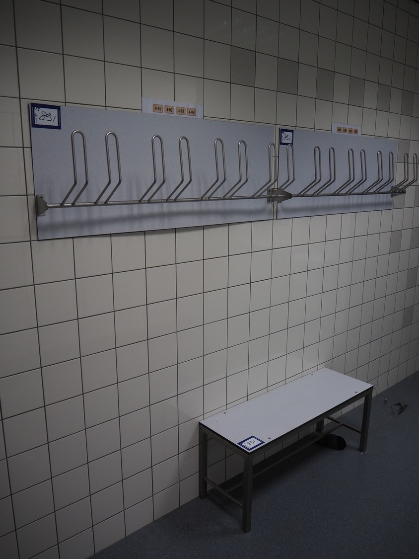 2 s/s wall mounted boot racks for 4 pairs of boots each, dimensions: (2x) 1150 mm x 180 mm x 250 mm. Including bench, dimensions: 1000 mm x 340 mm x 420 mm.