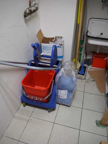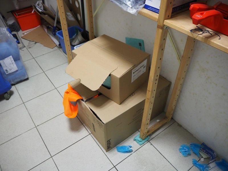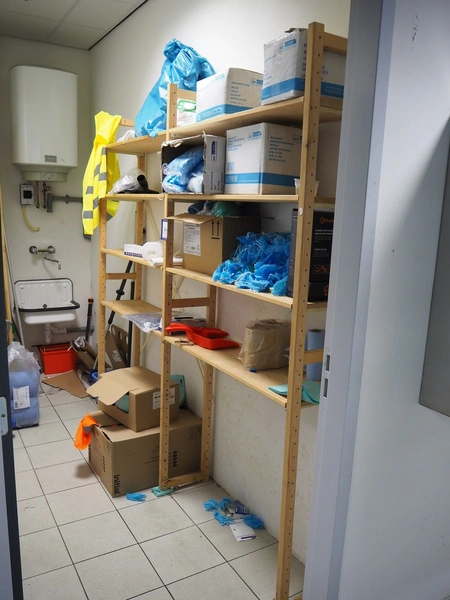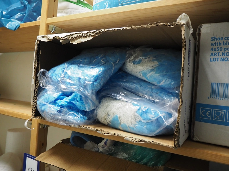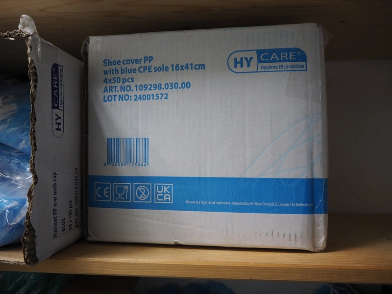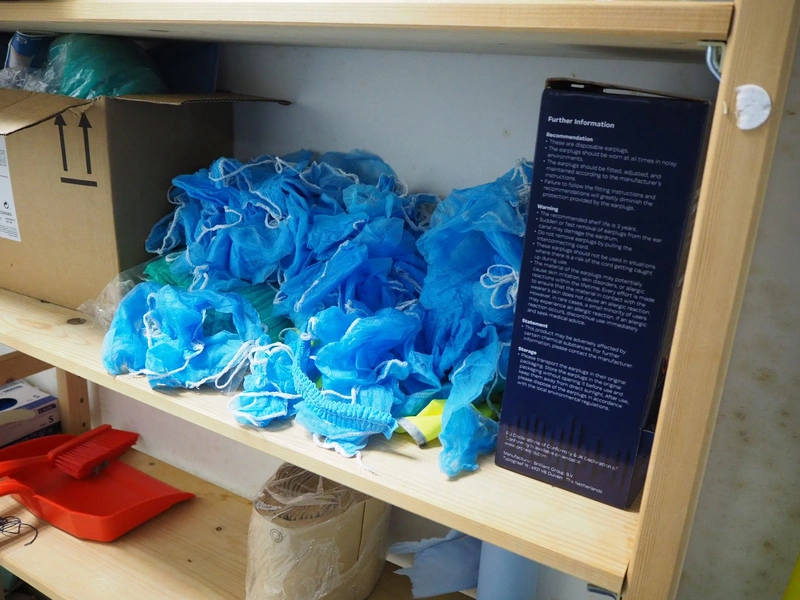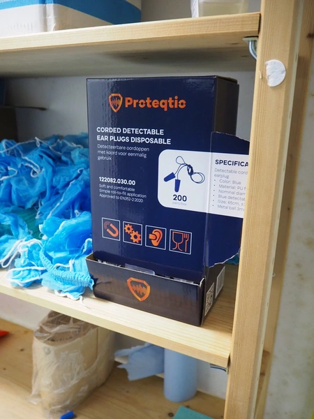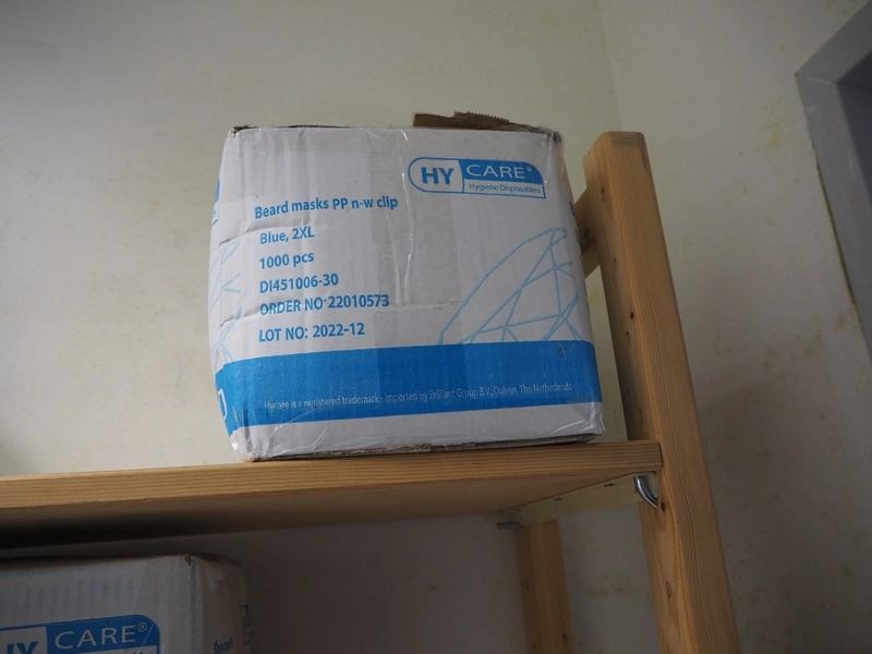 Storage unit with disposable hygiene equipment, among others: hairnets, beard nets, shoe covers and earplugs, dimensions: 2000 mm x 300 mm x 2080 mm.
