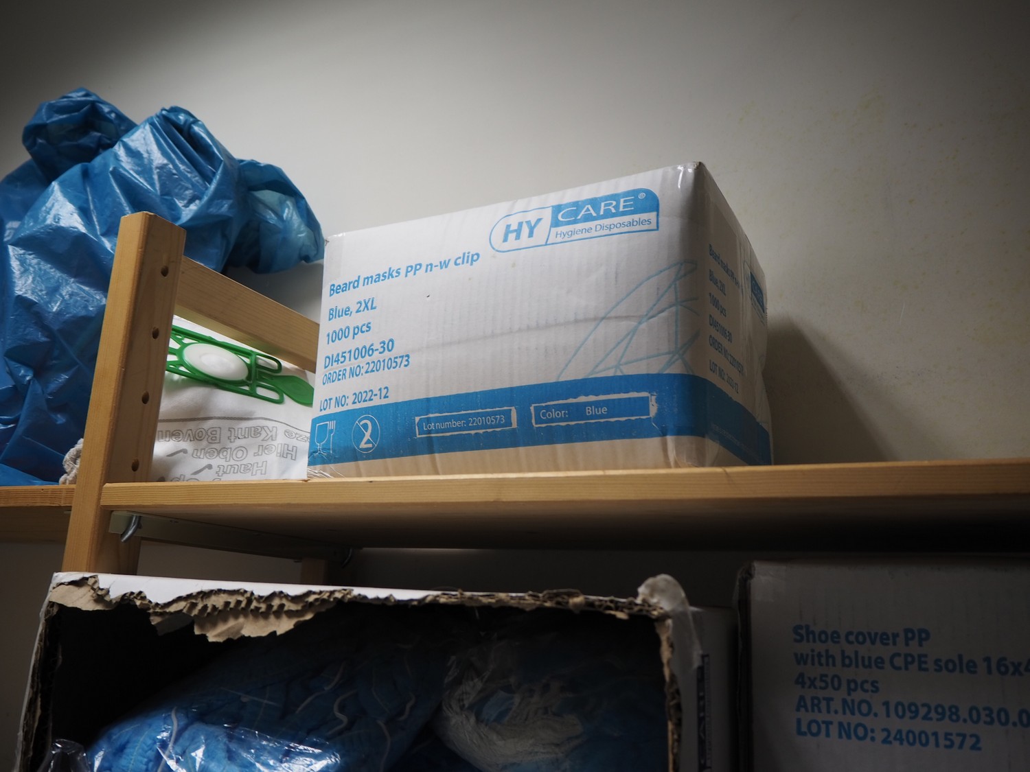 Storage unit with disposable hygiene equipment, among others: hairnets, beard nets, shoe covers and earplugs, dimensions: 2000 mm x 300 mm x 2080 mm.