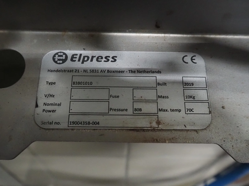 Elpress soap mixing station, type: 83801010, serial number: 19004358-004, year of construction: 2019, pressure: 80 bar, maximum temperature: 70°C, dimensions: 100 mm x 400 mm x 450 mm, 430 mm x 520 mm x 600 mm.