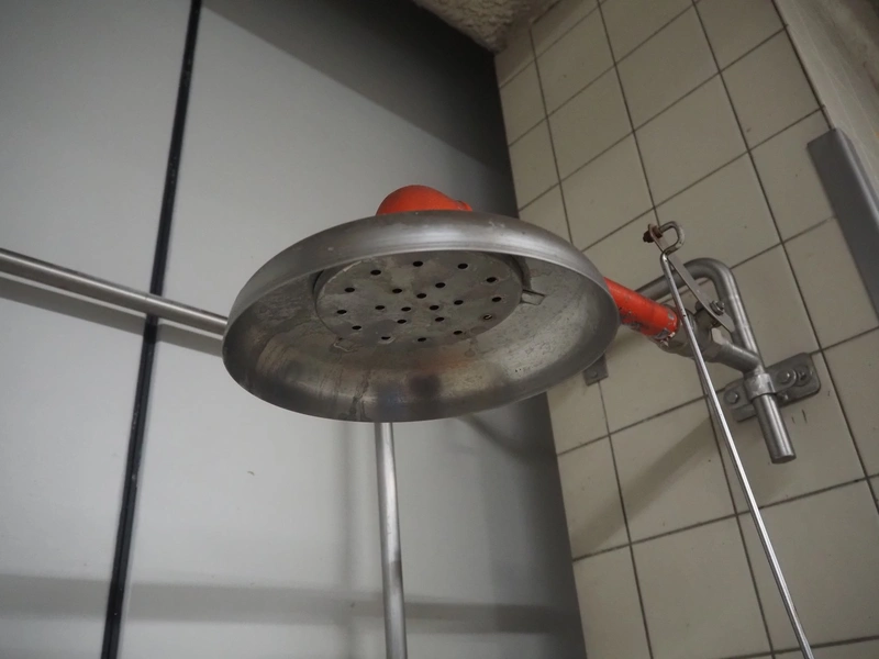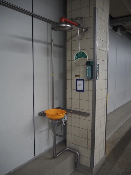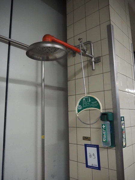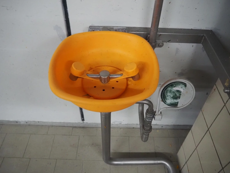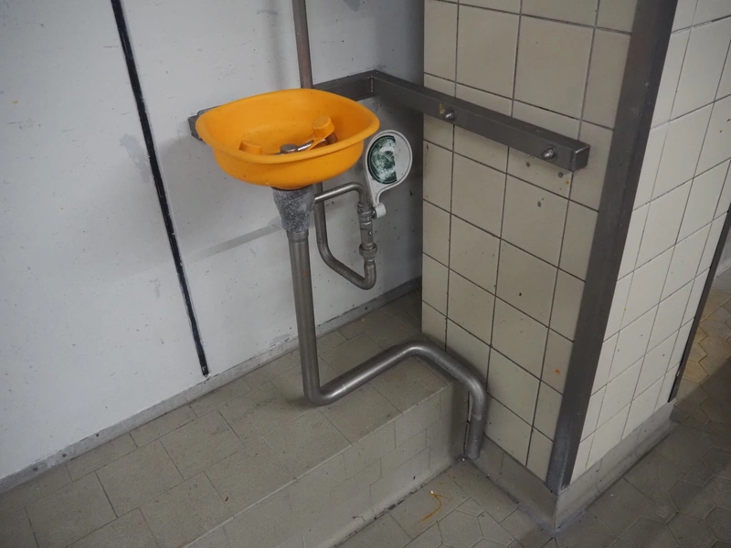 Maestro eye wash station with shower, sink with eye shower and eye shower bottle.