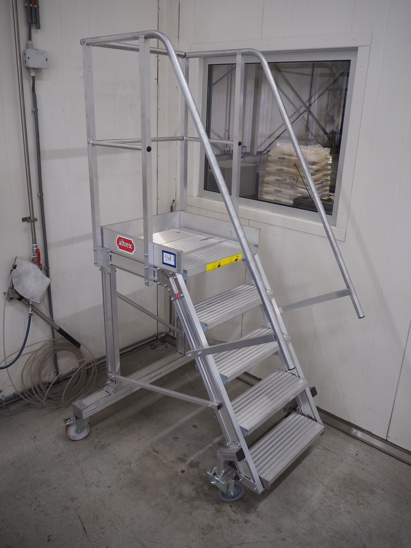 Altrex mobile aluminium stairs, platform height: 1200 mm, total dimensions: 1350 mm x 750 mm x 2300 mm.