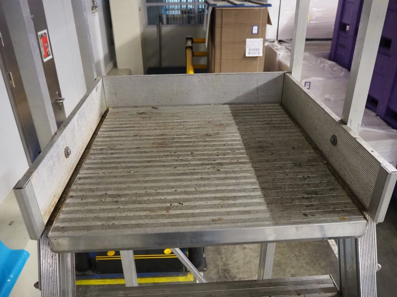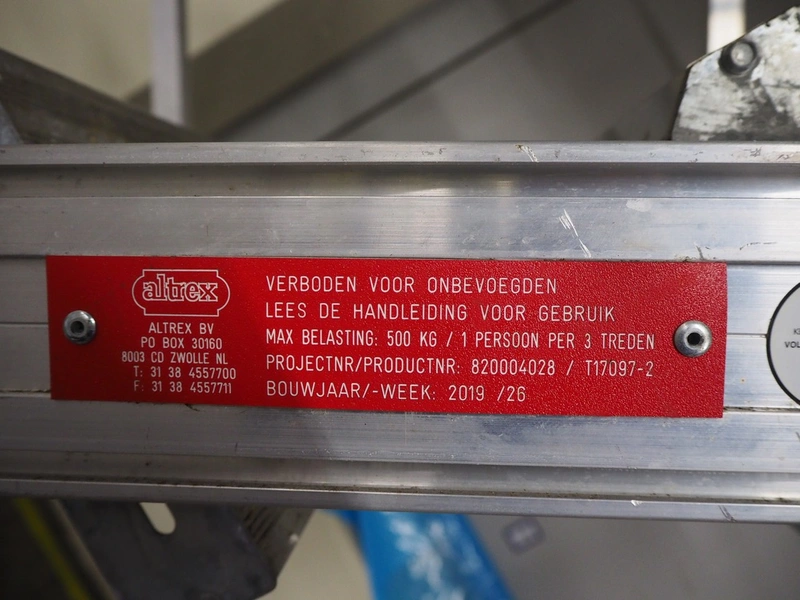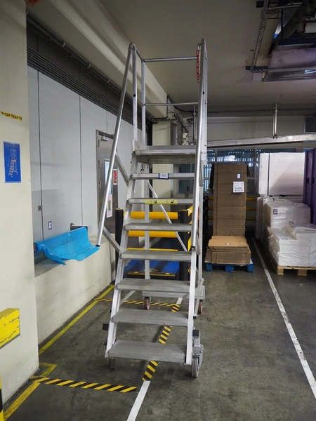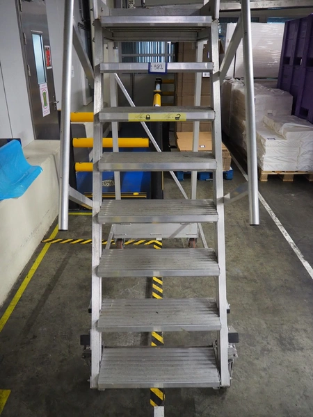 Altrex mobile aluminium stairs, year of construction: 2019/26, capacity: 500 kg, platform height: 1850 mm, total dimensions: 1700 mm x 700 mm x 2950 mm.
