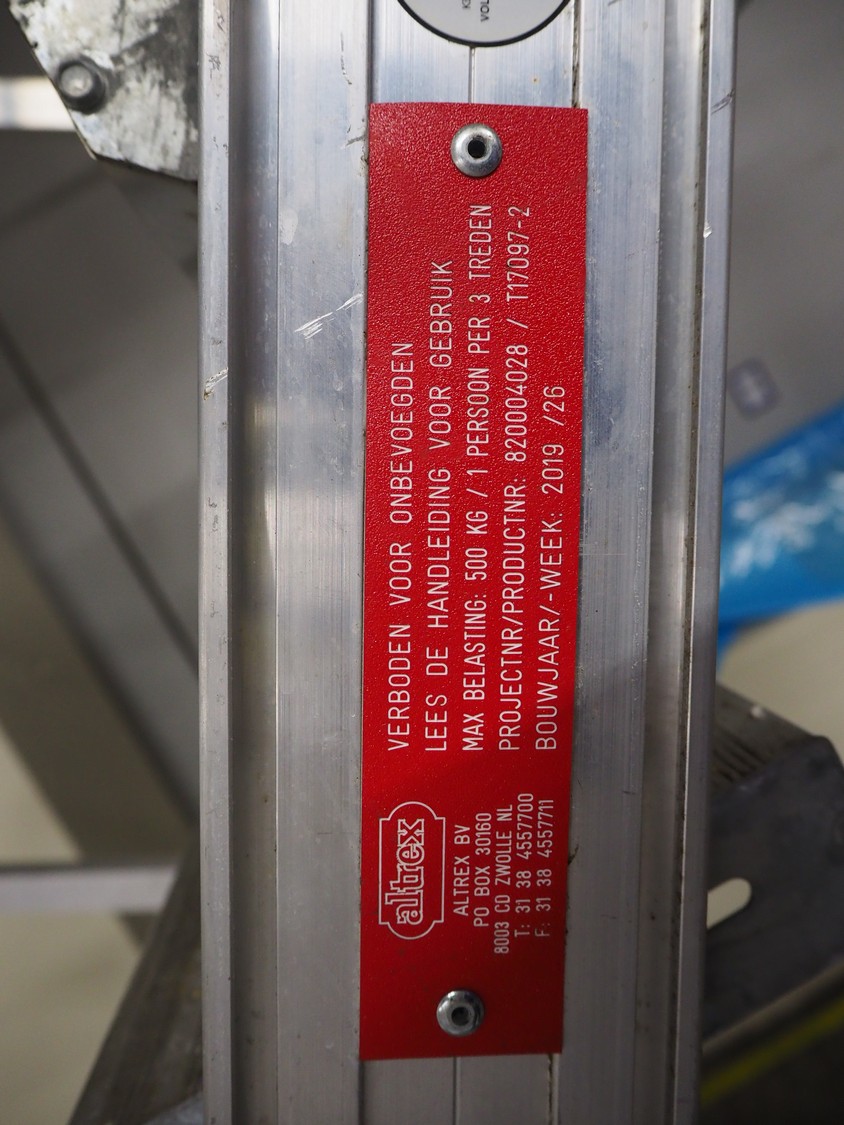 Altrex mobile aluminium stairs, year of construction: 2019/26, capacity: 500 kg, platform height: 1850 mm, total dimensions: 1700 mm x 700 mm x 2950 mm.