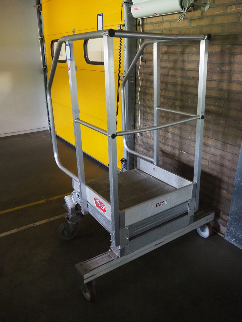 Altrex mobile aluminium stairs, year of construction: 2020/31, capacity: 500 kg, platform height: 450 mm, total dimensions: 1000 mm x 1300 mm x 1600 mm.