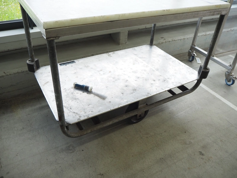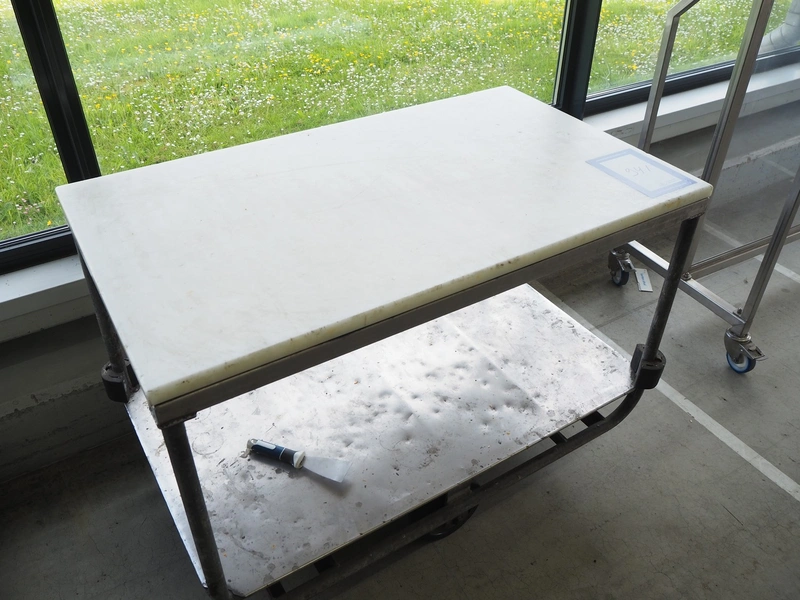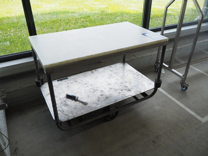 Mobile table, s/s frame, plastic top, dimensions: 1200 mm x 700 mm x 880 mm.