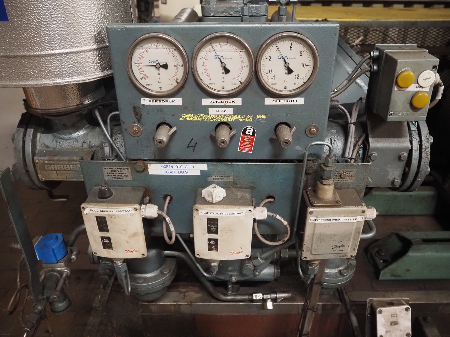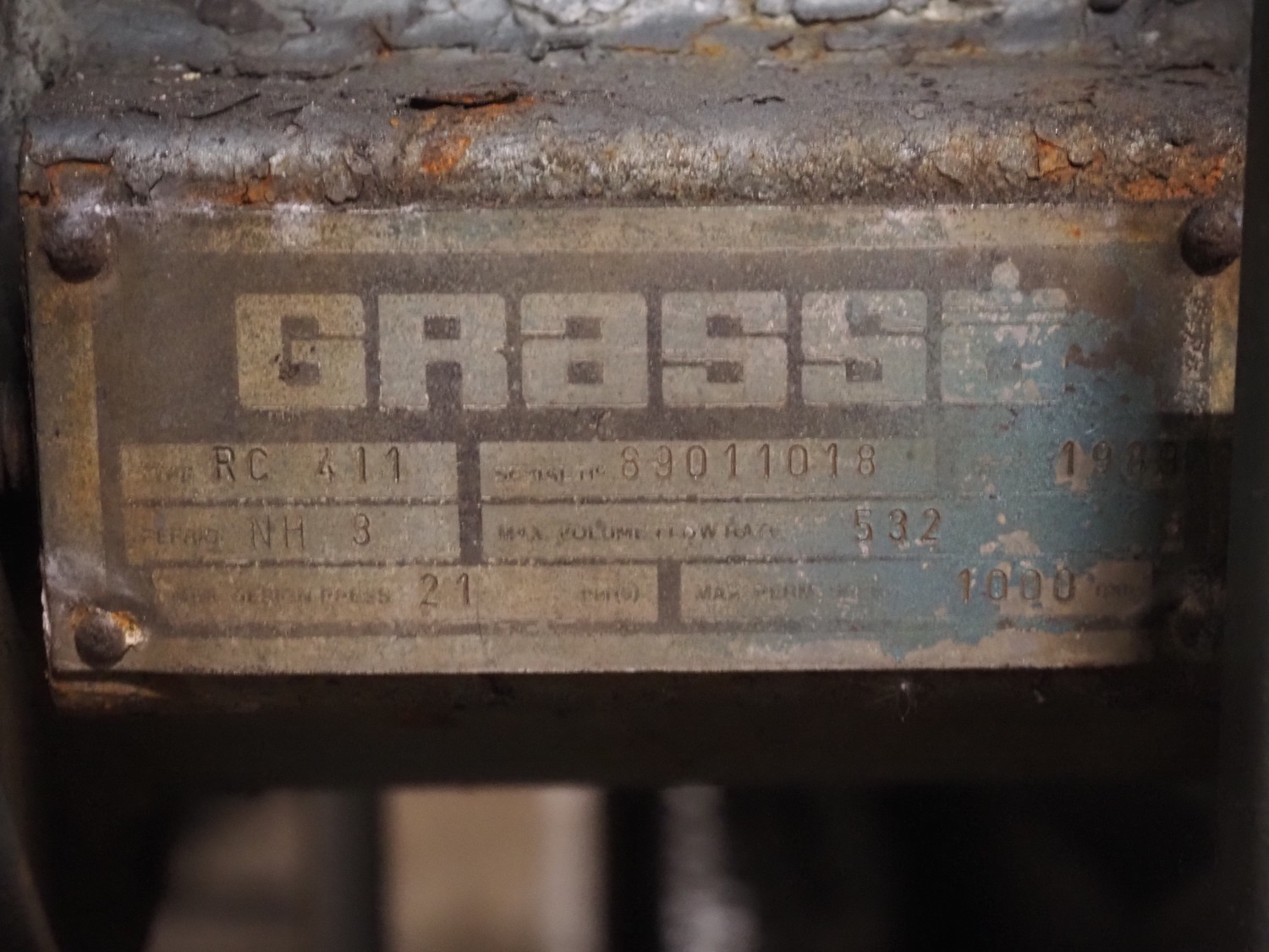 Grasso cooling compressor, type: RC 411, serial number: 89011018, year of construction: 1989, refrigerant: NH3, dimensions: 1400 mm x 2300 mm x 1500 mm.