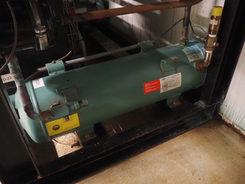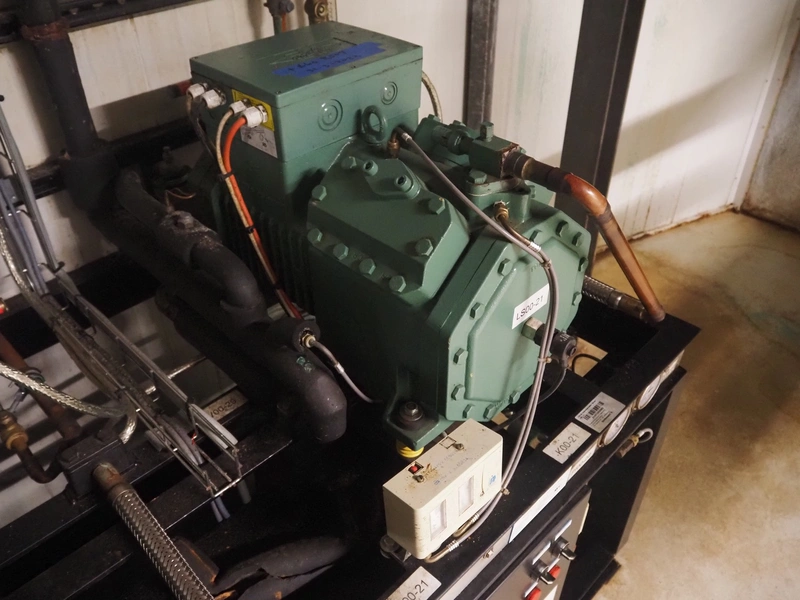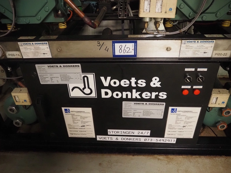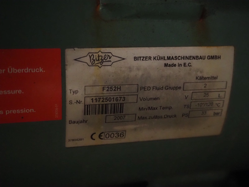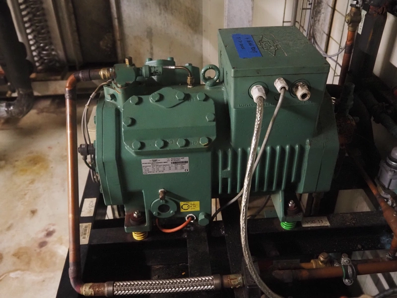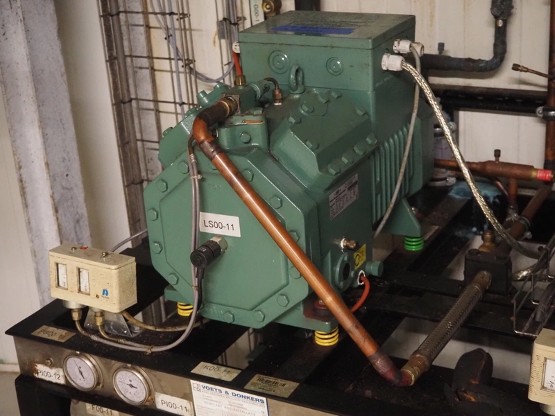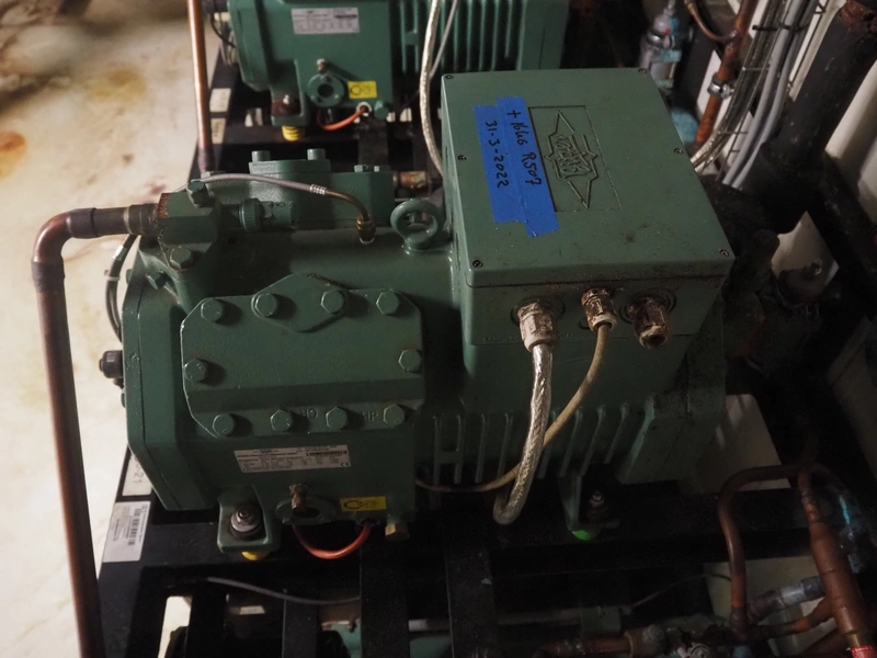 Compressor rack with 2 Bitzer Kühlmaschinenbau GmbH cooling compressors, type: 4VCS-10.2Y-40P, serial number: 1672614493 and 1672406706, dimensions: 1500 mm x 1000 mm x 1100 mm.